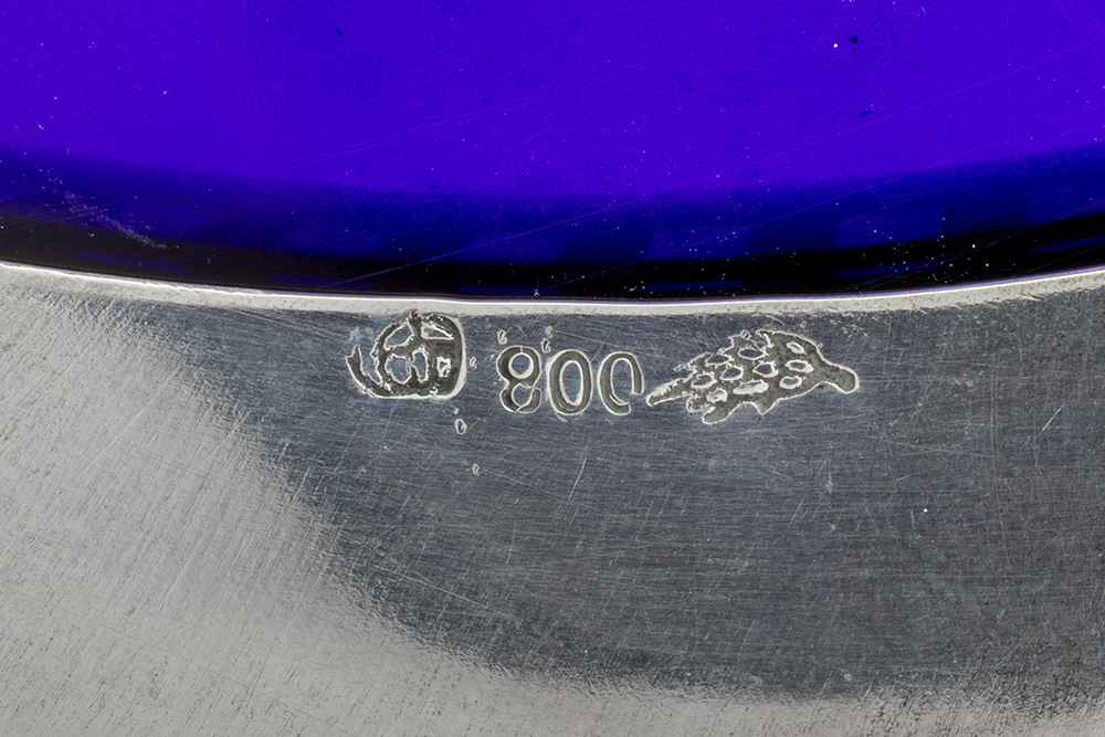 antique quite big neoclassical centerpiece in “800” marked silver with its original blue glass liner