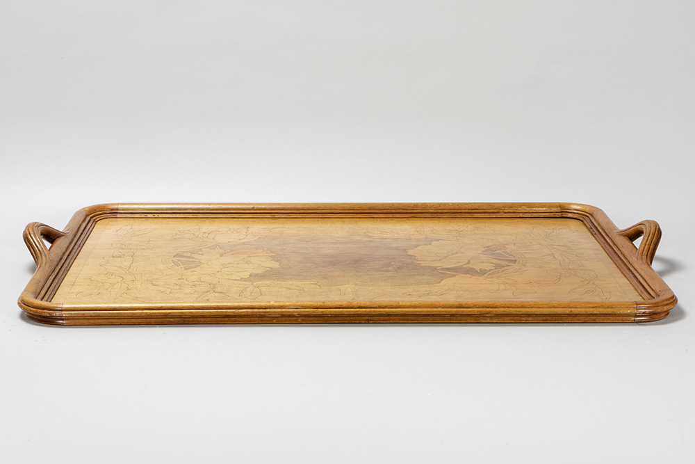 Vrij grote Art Nouveau-dienplateau in blonde notelaar met een floraal decor (pyrogravure) – 56,5 x 90 cm – ca 1900