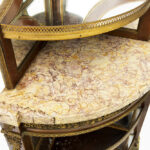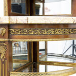 FRANKRIJK – 19° EEUW fraai apart neoclassicistisch hoekmeubeltje in rozenhout, rijk versierd met gedoreerd bronsbeslag (oa met ramskopjes) en met binnenin étagères, bekleed met spiegelglas – 137 x 61 x 38 cm