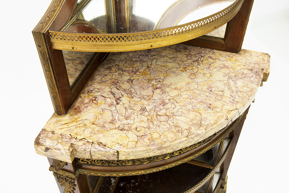 19th Cent. French neoclassical corner cabinet in rosewood with rich mountings in gilded bronze and with inside mirrored what-nots