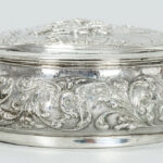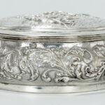 HOLLANDIA ZILVERSMEDERIJ (B.W. van Eldik) ronde Nederlandse bonbonnière in massief zilver, gemerkt “C (1937?)”, met typische repoussé-decors – diameter : 12 cm – gewicht : 222 gram