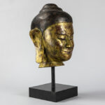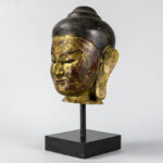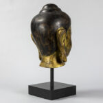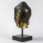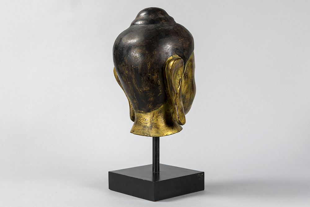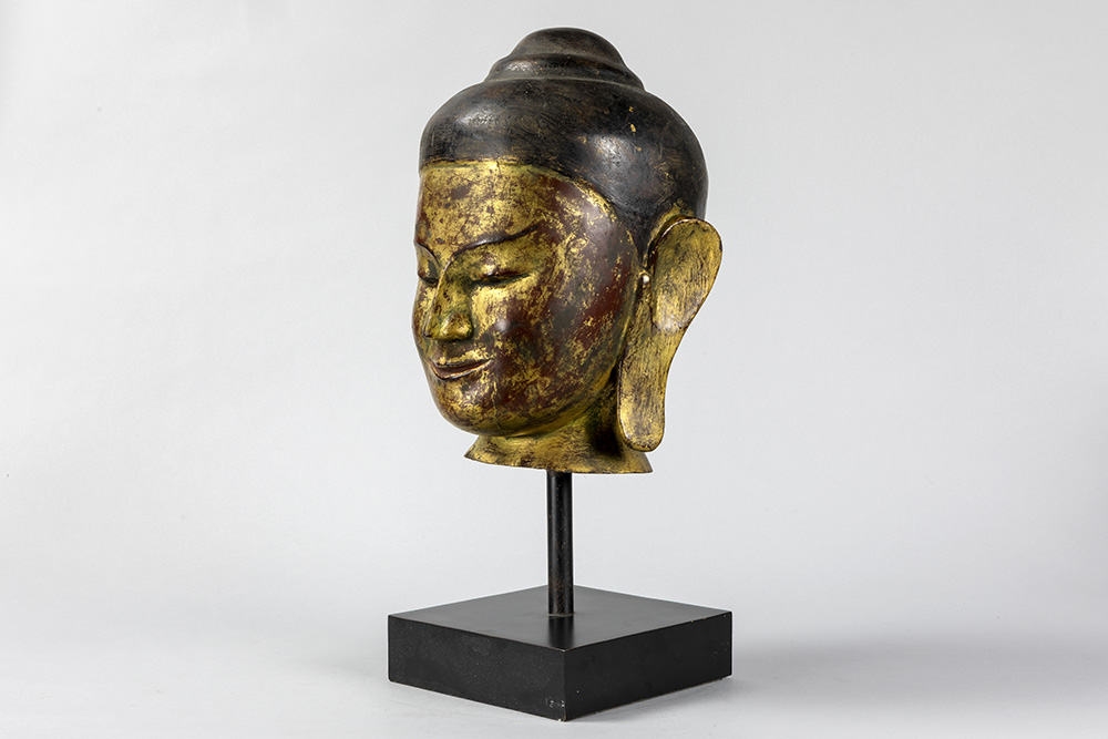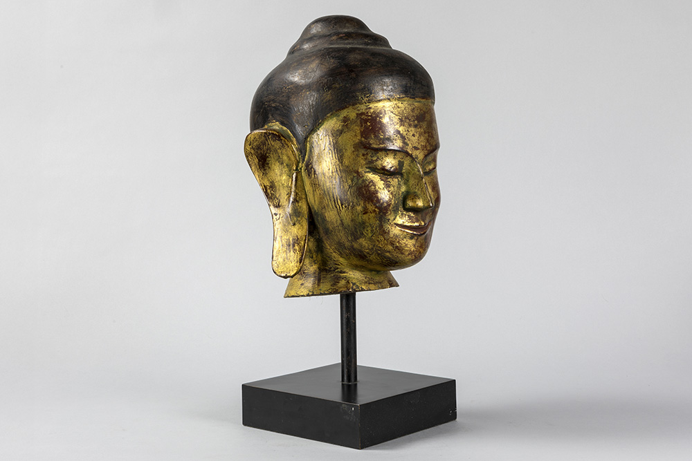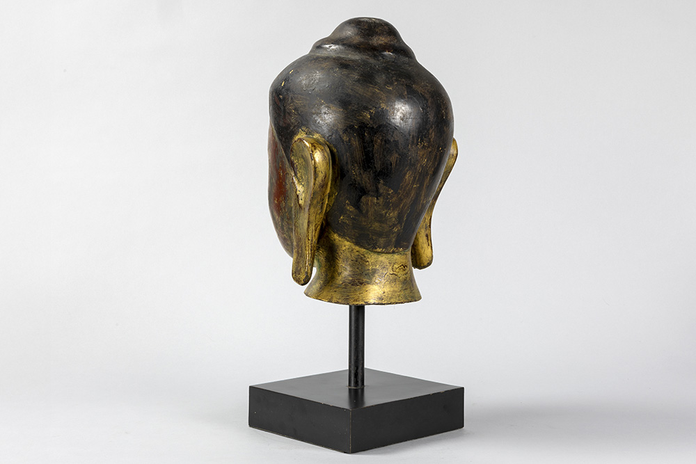 Mooie achttiende eeuwse Zuid-Oost Aziatische sculptuur in gepolychromeerd hout : “Hoofd van een Boeddha” – hoogte : 35 cm – gemonteerd