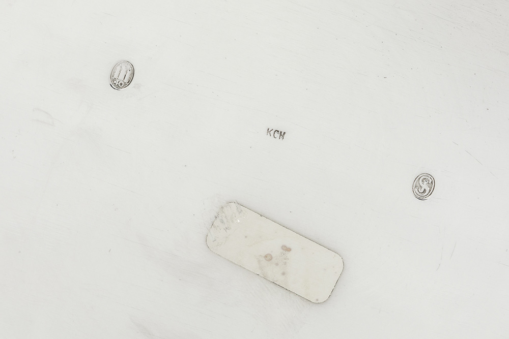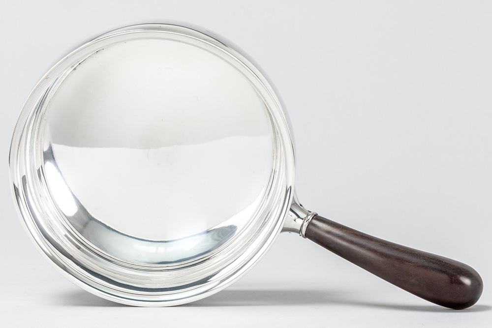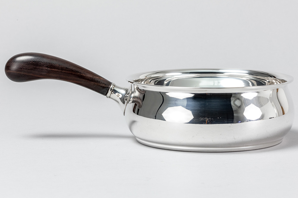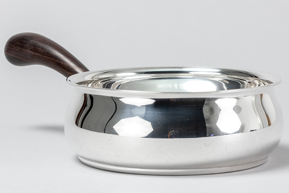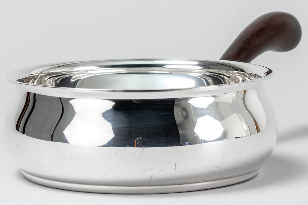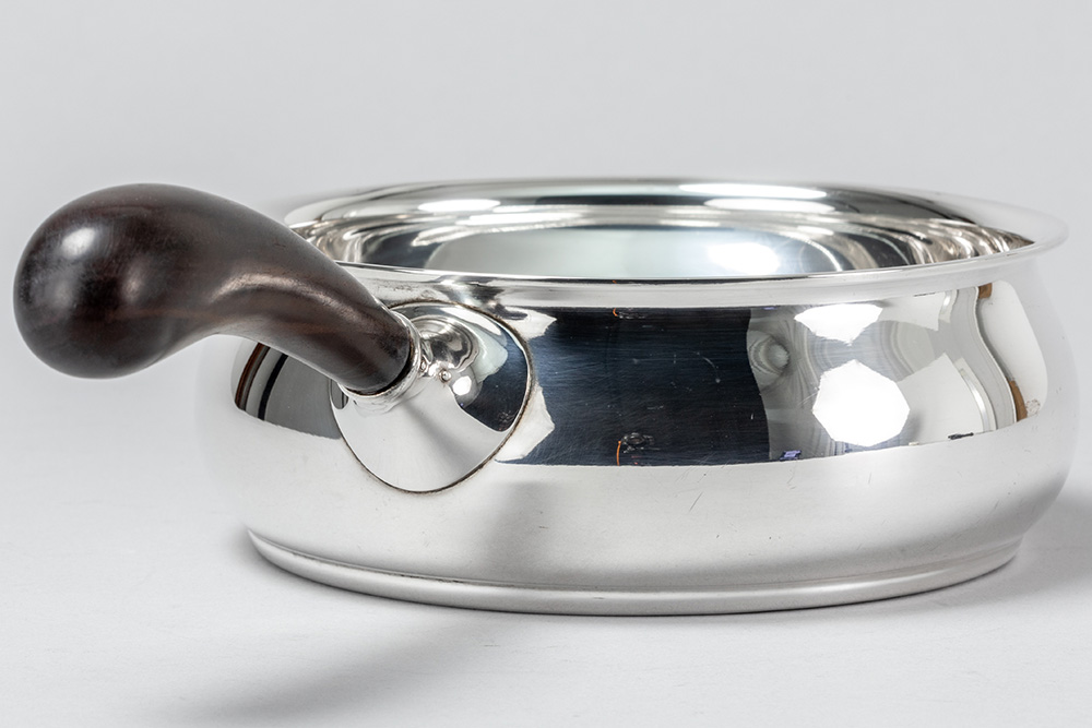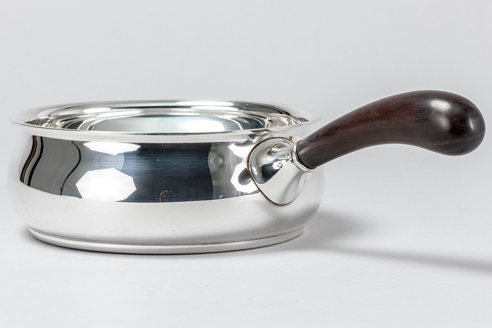 Deense Art Deco-steelpan in massief zilver, gemerkt “1° gehalte – Kopenhagen 1940”, met greep in ebbenhout – met keur van Sigsgaard – diameter : 16 cm – gewicht : 368 gram