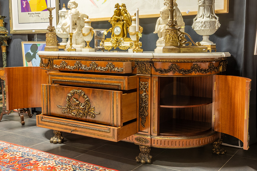 imposing neoclassical sideboard with curved sides after the one made by Joseph Stöckel and Guillaume Benneman dd 1786 for the bedroom of Louis XVI in the castle of Compiègne – in mahogany, richly decorated with bronze mountings (including garlands, bows, birds, …), with four drawers and two doors & with a thick white marble top and with lion claw feet in bronze the original is at the Castle of Versailles