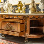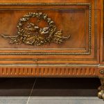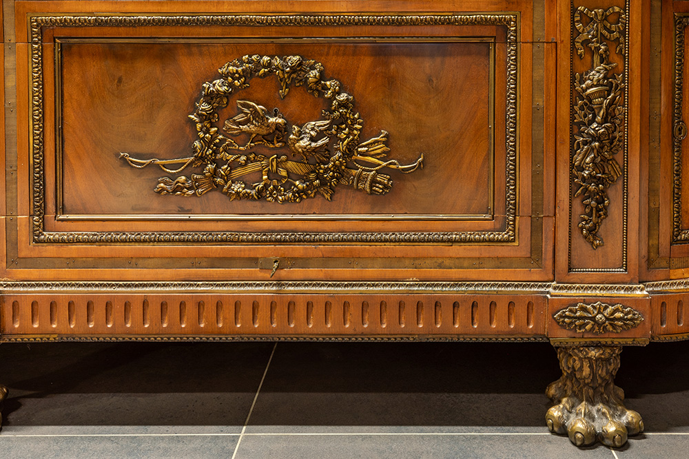 JOSEPH STÖCKEL (1743 – 1802) en GUILLAUME BENNEMAN – NAAR imposant neoclassicistisch dressoir met gegalbeerde zijkanten in acajou, rijk versierd met bronsbeslag (oa guirlandes, strikken, vogels, …), met vier laden en twee deuren & met dik wit marmeren blad en met leeuwenklauwenpoten in brons – 96 x 215 x 71 cm in oorsprong gerealiseerd dd 1786 voor de slaapkamer van Louis XVI in het kasteel van Compiègne, en dat nu bewaard wordt in Versailles