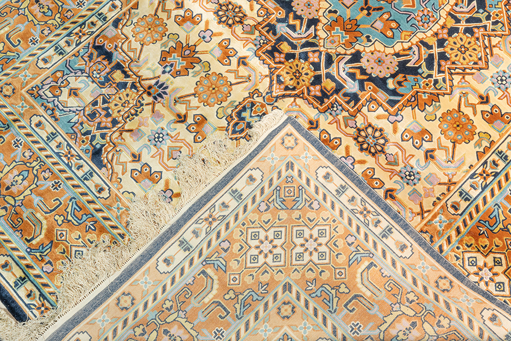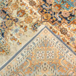 Fijngeknoopt Oosters tapijt in zijde op zijde met een medaillon omringd door gestileerde bloemen op een beige fond – 274 x 187 cm