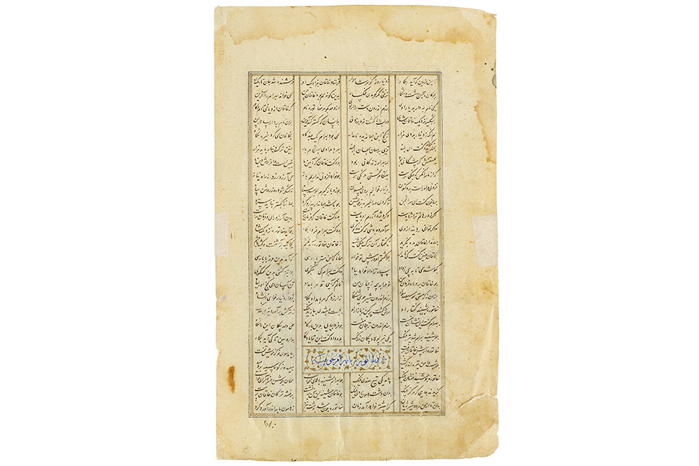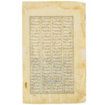16th Cent. Persian early Safavid period illuminated Shahnameh Page : a manuscript page from Ferdawsi’s Shahnameh, depicting a key moment in the story of Bahram Gur. The text is arranged in four columns in nasta’liq script, with a painting executed in opaque pigments heightened with gold on paper.