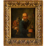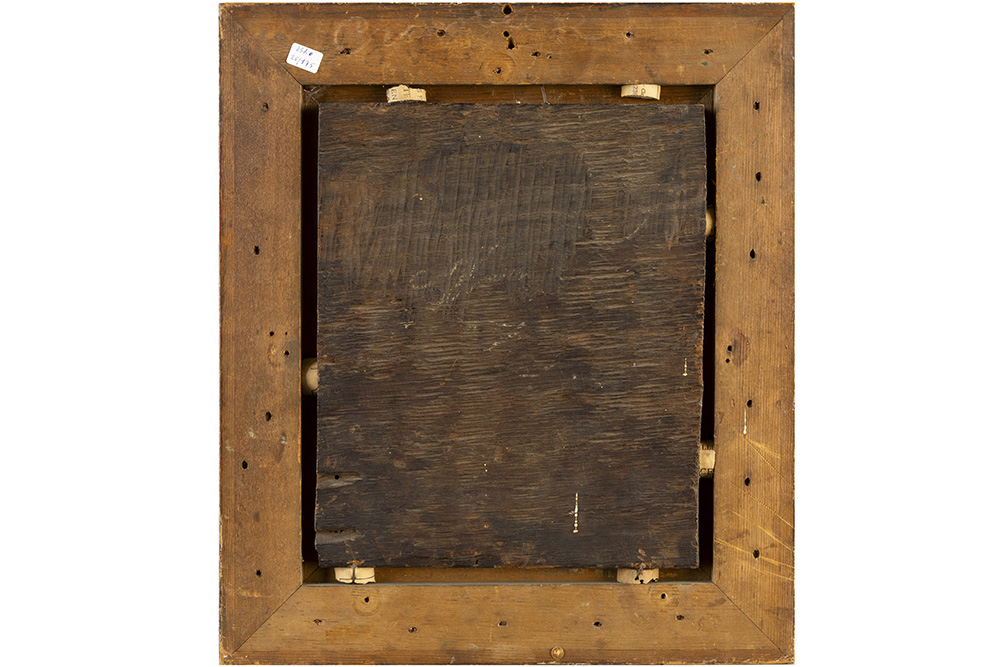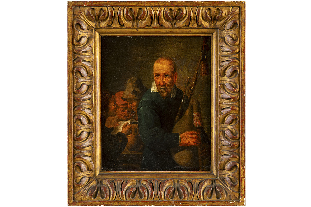 Antiek olieverfschilderij op paneel in de stijl van Teniers : “Doedelzakspeler” – 26 x 21,5