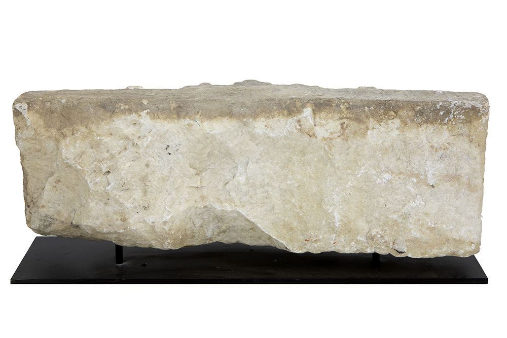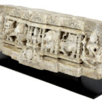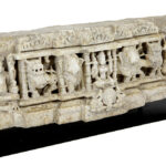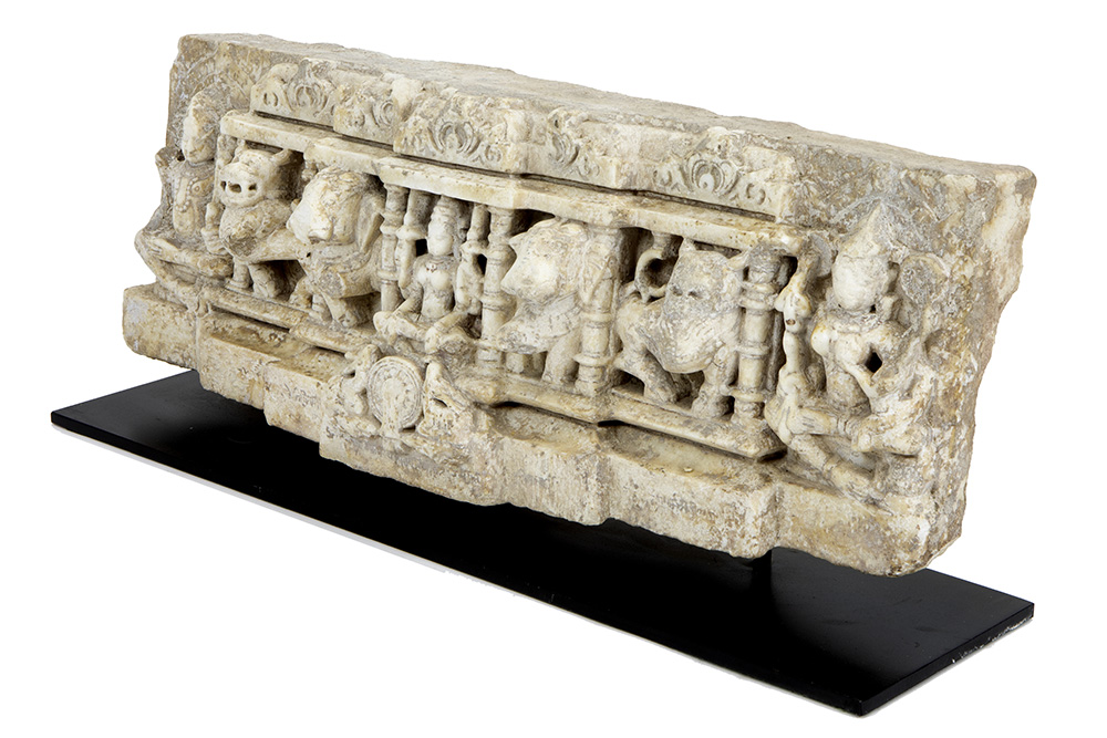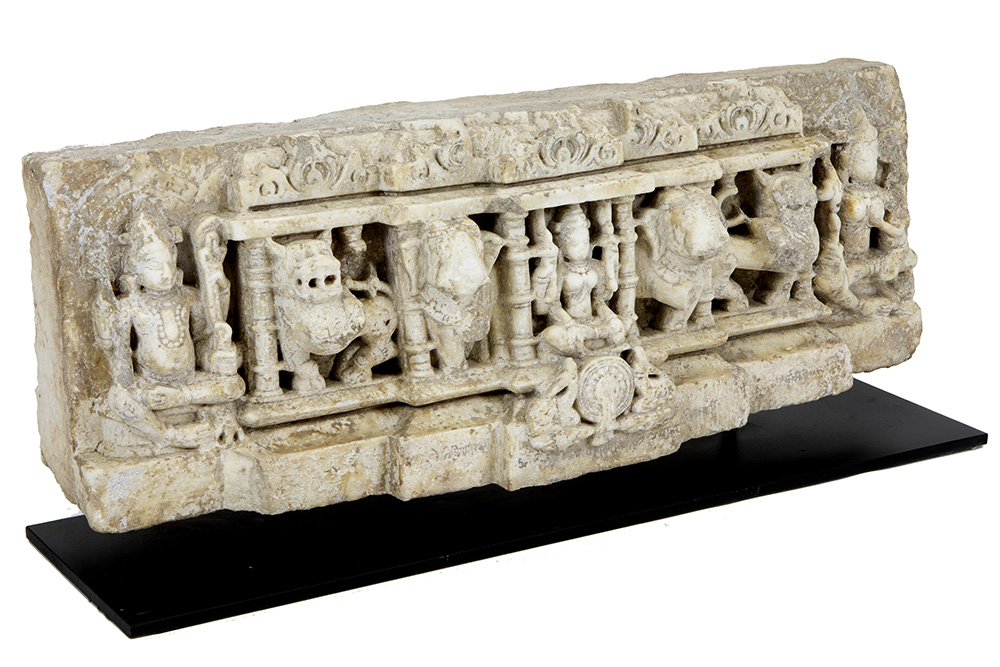 NOORD INDIA / GUJARAT – 16° EEUW vrij uitzonderlijk Jain-tempelfragment in witte marmer (24 x 75 x 18) met centraal de afbeelding van de Jain tirthankara Shantinath in vrouwelijke vorm (herkenbaar aan zijn symbool: het hert). Shantinath was de 16de tirthankara van de 24 van het huidige Jain tijdperk (“Avasarpini”). Samen met Rishabhanatha, Neminatha, Parshvanatha en Mahavira is hij één van de vijf tirthankars die onder de Jains de meeste devotionele verering aantrekken voor het afwenden van epidemieën, vuur, hongersnood, oorlog, rovers, enz. De tirthankara wordt eerst geflankeerd door olifanten en leeuwen, daarna door “Sasana-devatas” (begeleidende geesten) – gemonteerd