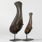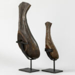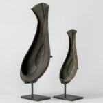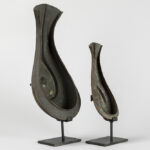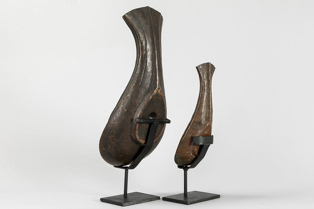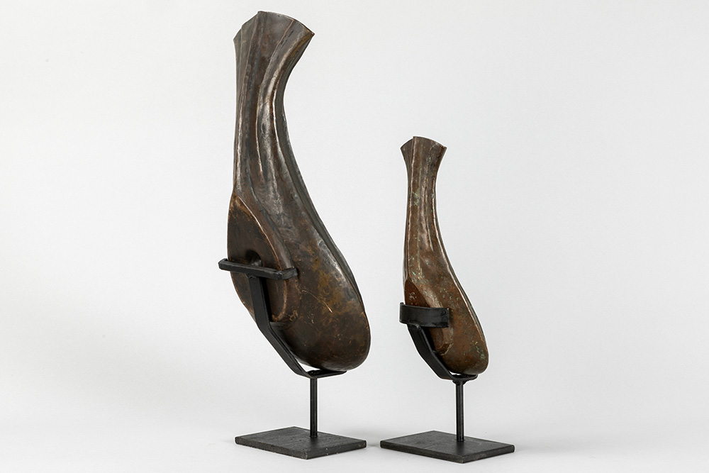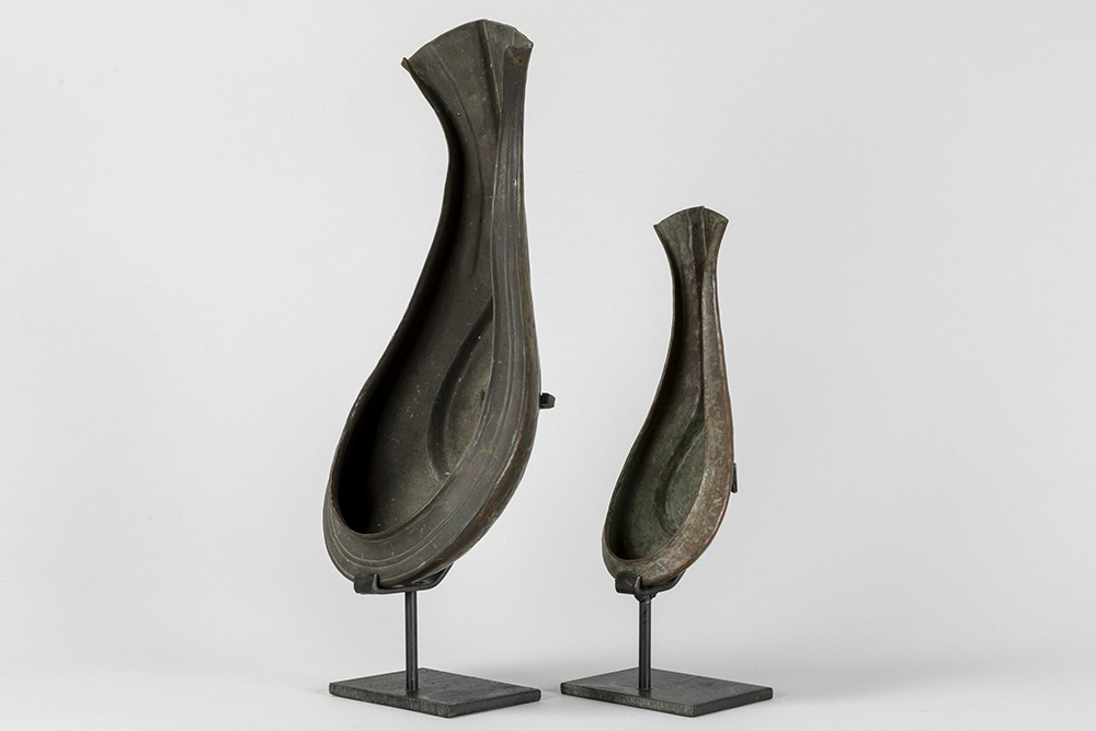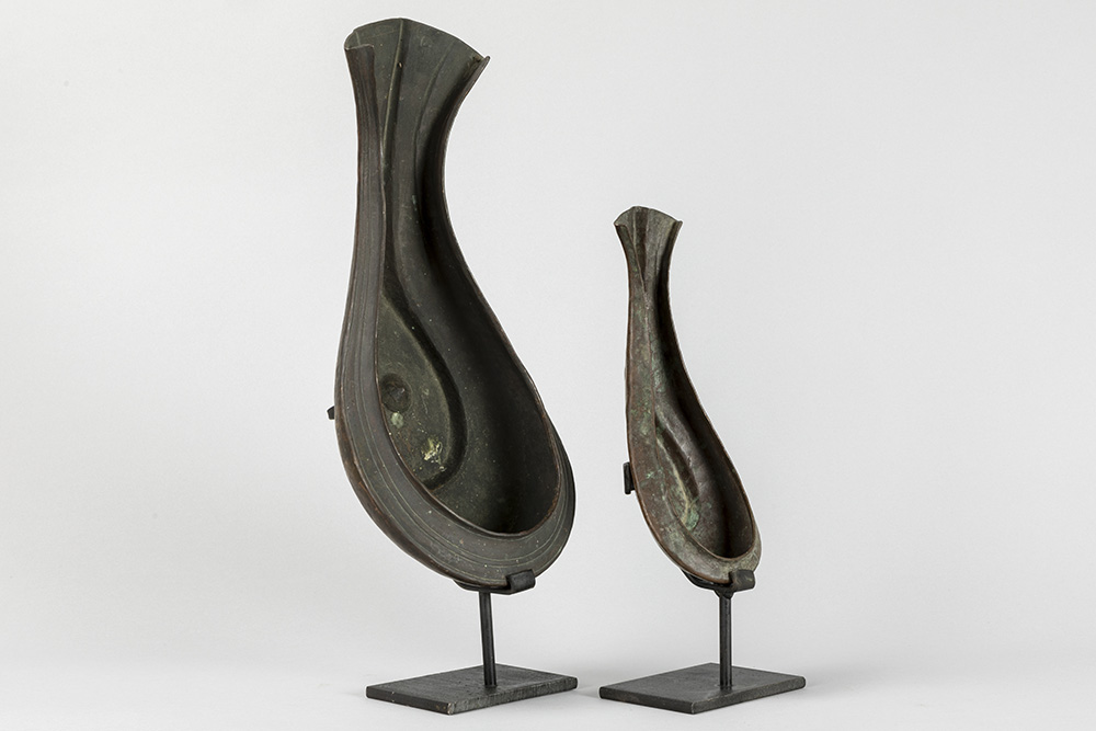 INDIA – 19° EEUW of vroeger twee schelpvormige rituële “Yoni” – coupes in rood koper, die werden gebruikt om de lingam in te deponeren – breedtes : 26,7 en 40 cm De yoni is een sanskriet woord dat vagina, vulva en baarmoeder kan betekenen. Symbool voor de vrouwelijke kracht, oorsprong en levensbron.