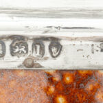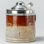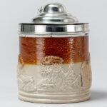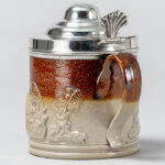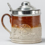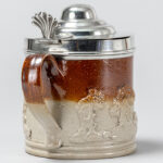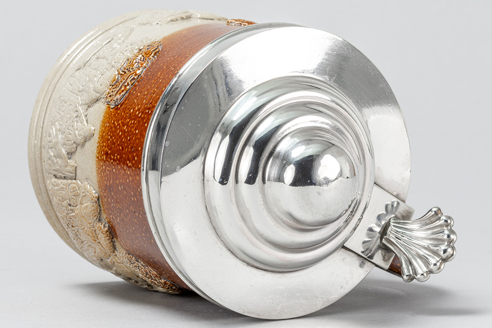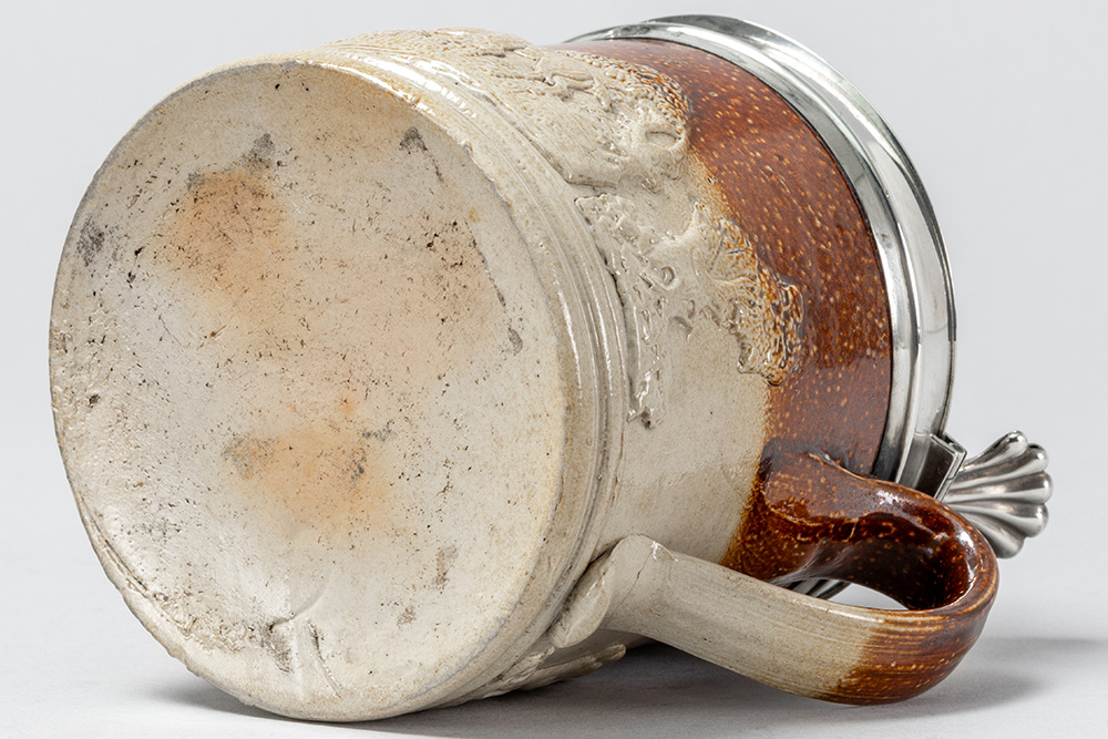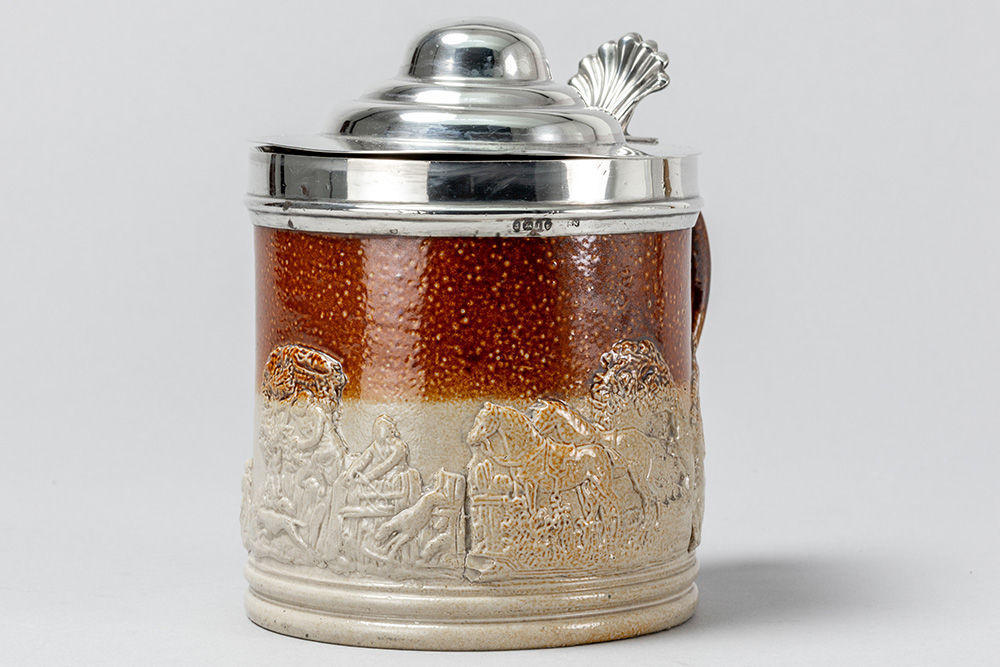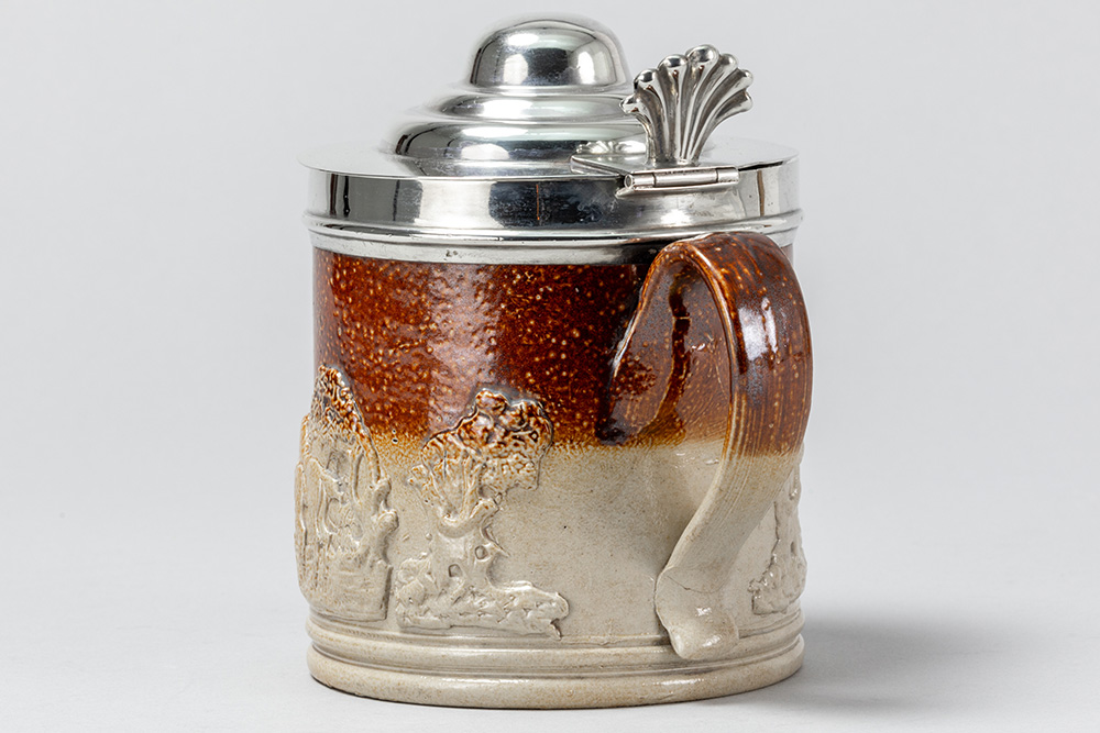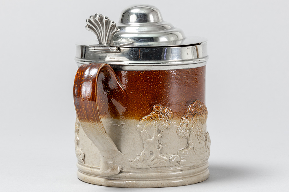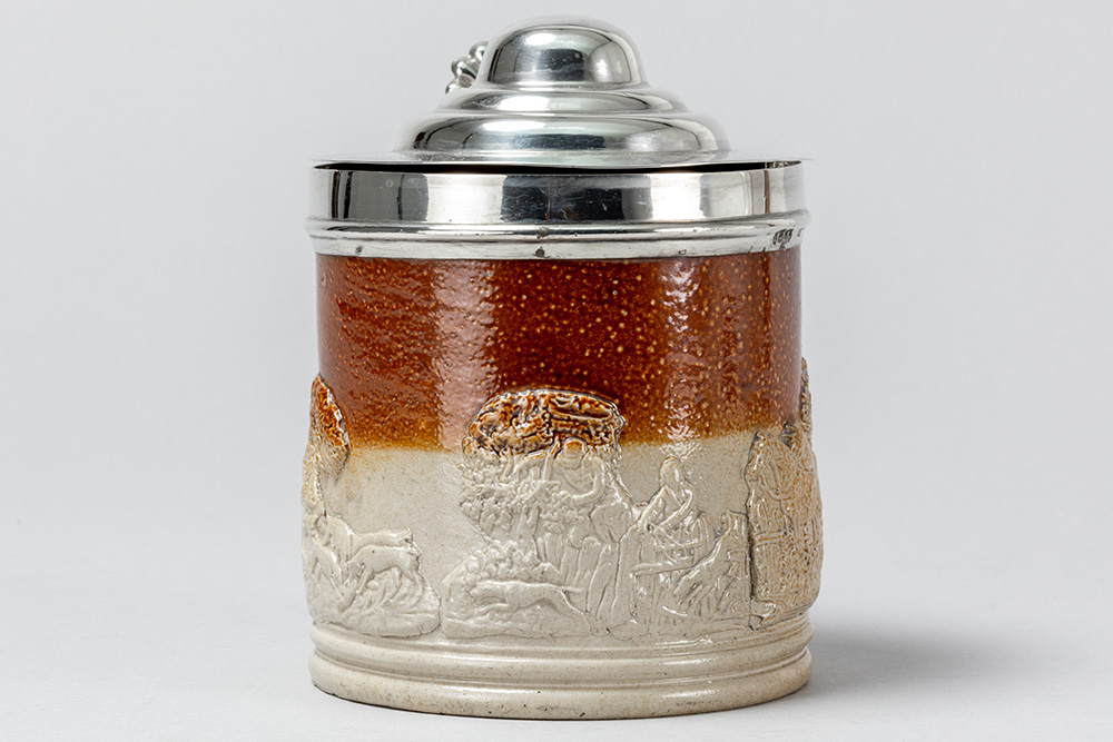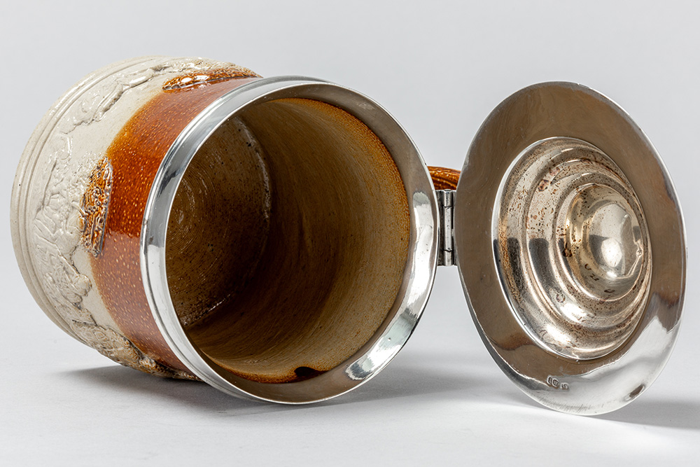 SAMUEL NEVILLE antieke bierbeker in grès met bandendecor met personages in reliëf en met montuur in massief zilver, gemerkt “Dublin 1805” – hoogte : 18,5 cm getekend