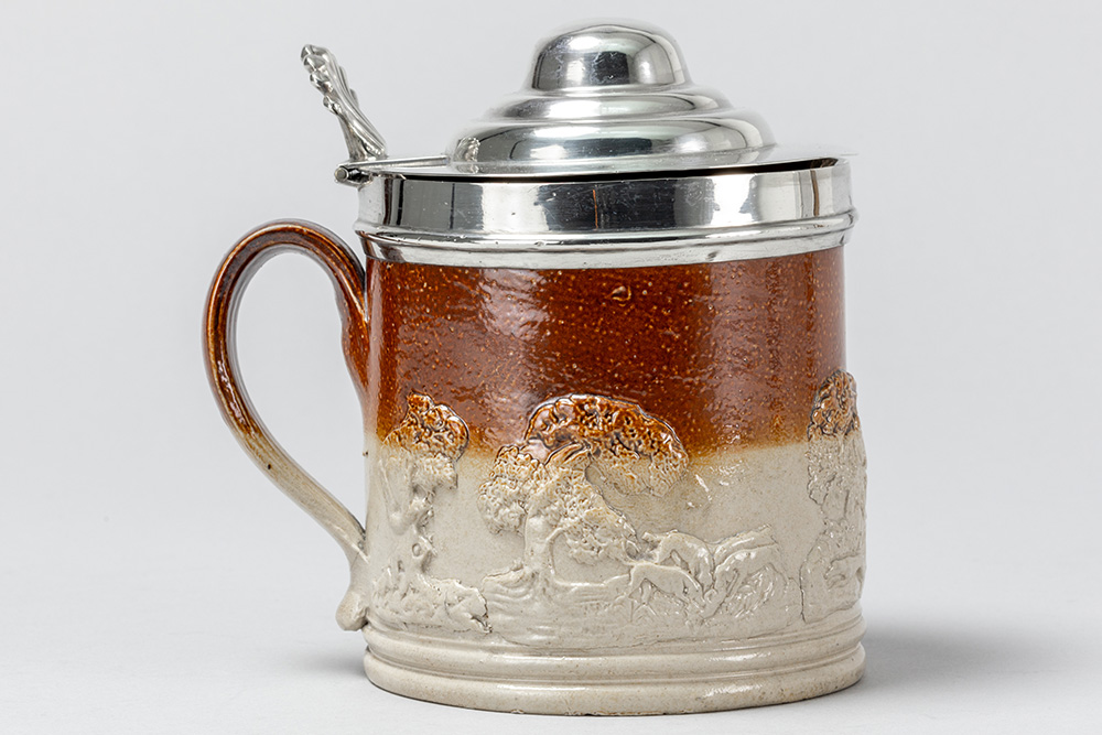 antique Irish tankard in earthenware and “Samuel Neville” signed silver, marked Dublin 1805