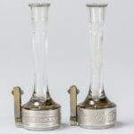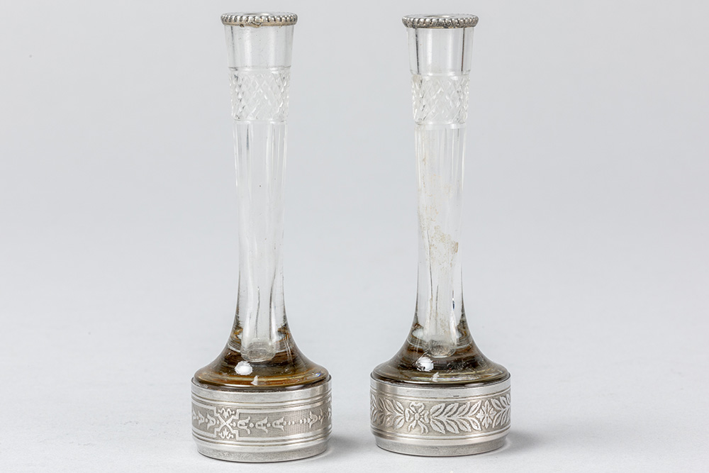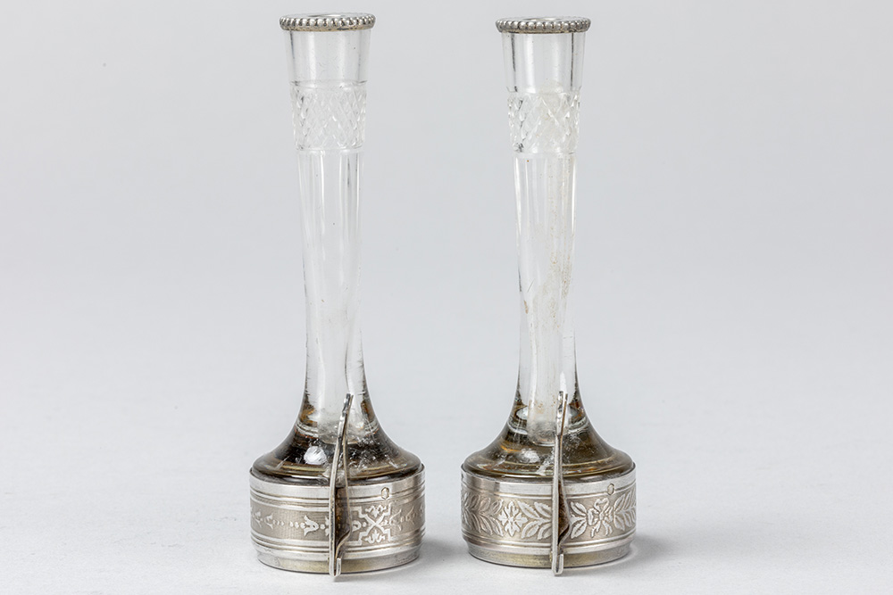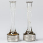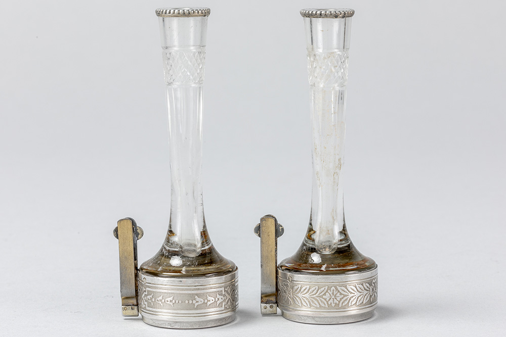 pair of small antique menu holders, each with a vase, in glass and silver