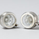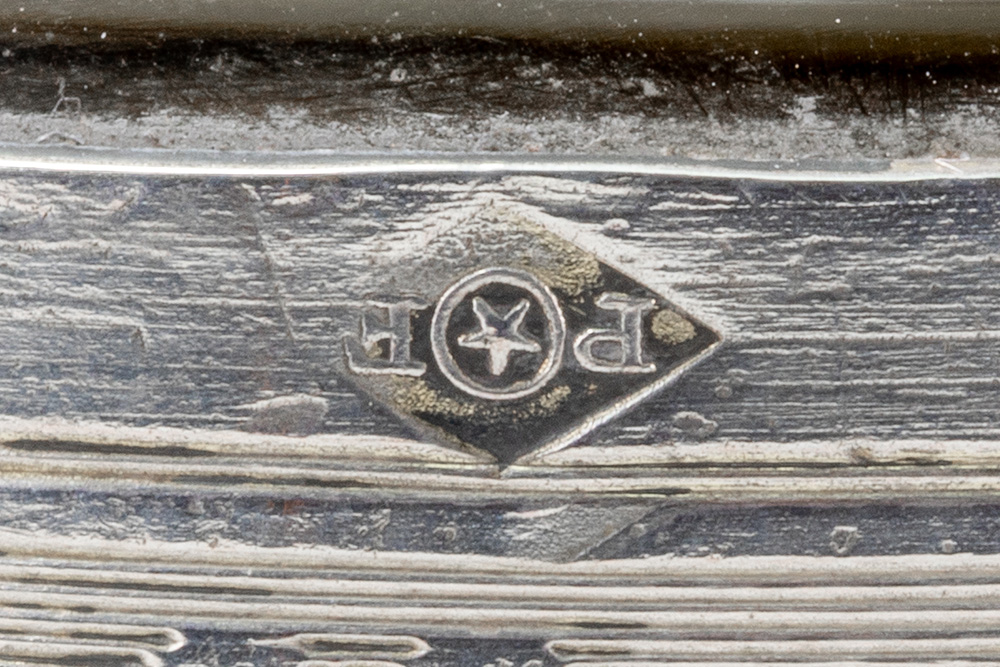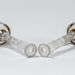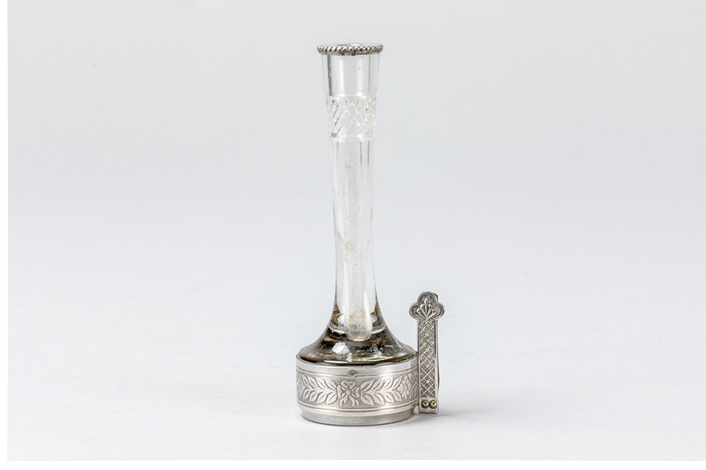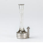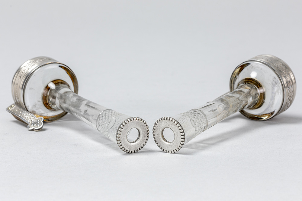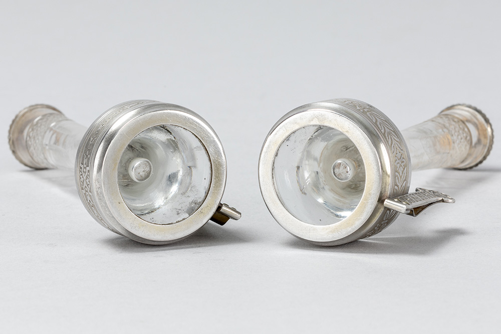 Paar antieke menuhouders telkens met vaasje in glas met een montuur in massief zilver – hoogte : 11 cm