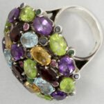vintage ring in silver with a quite big crown with all sorts of colorful (semi-)precious stones such as peridotes, amethysts, grenades, … and rubies