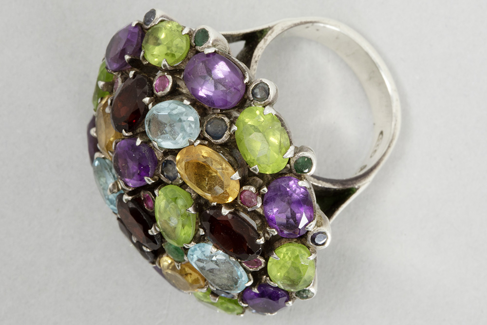Vintage ring in zilver met een vrij groot sierstuk bezet met allerlei (half)edelstenen zoals peridoot, amethiste, granaat, … en robijn