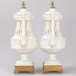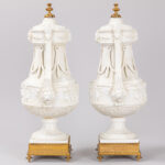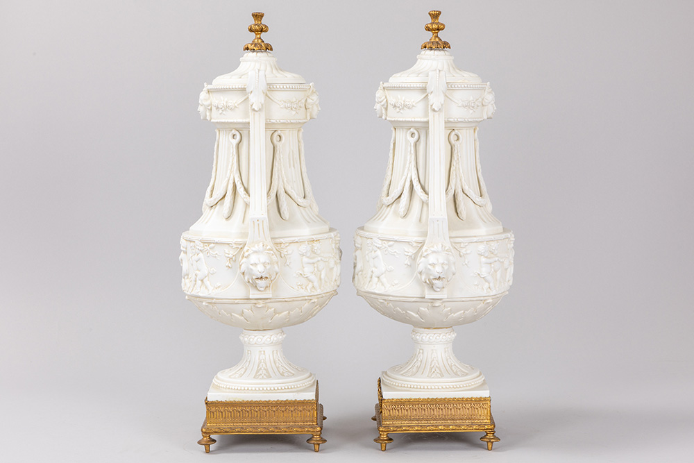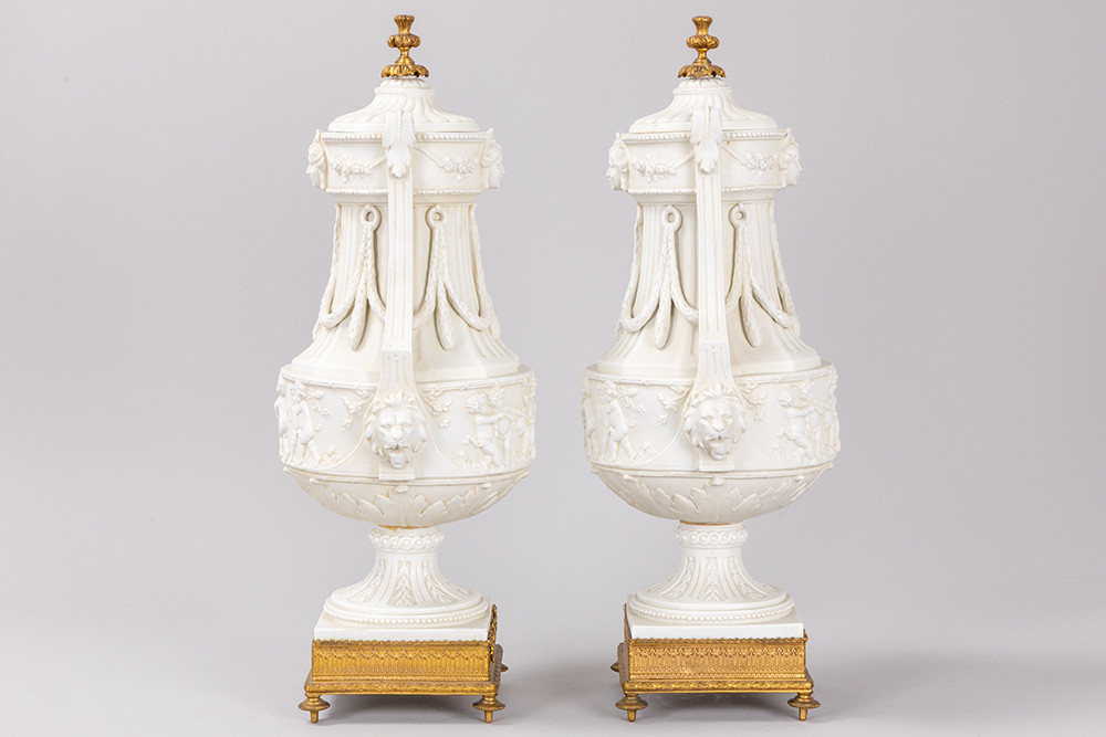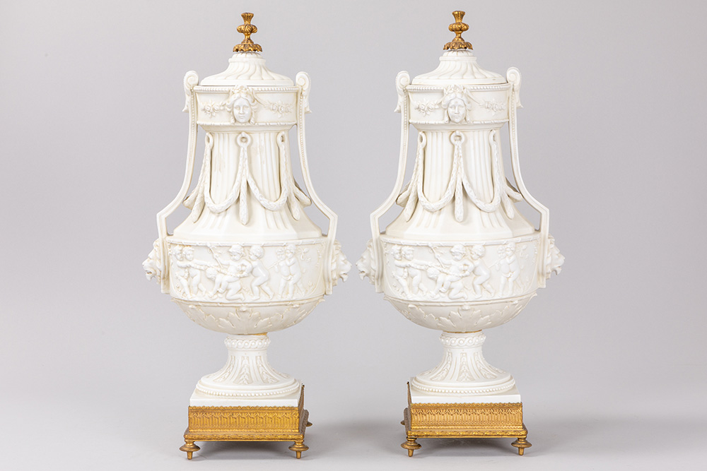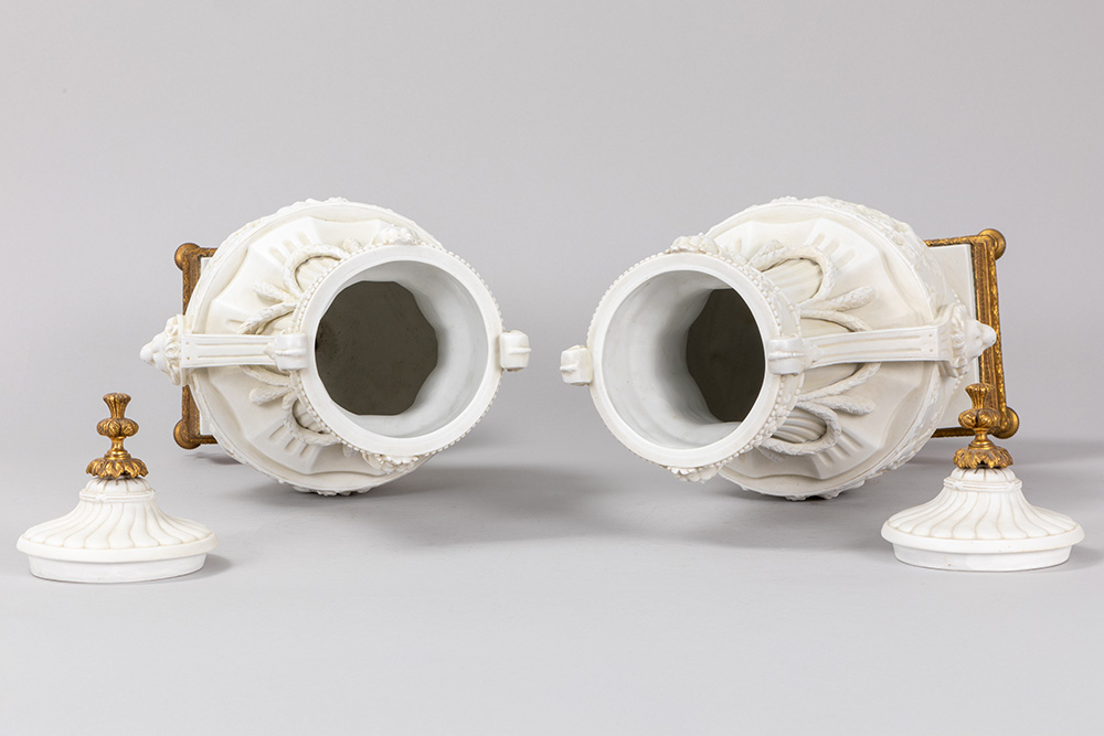 pair of antique neoclassical lidded vases in biscuit-porcelain with base in gilded metal
