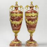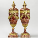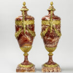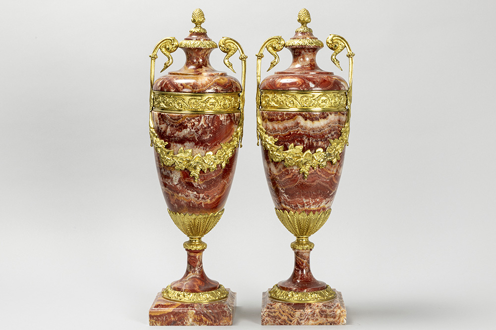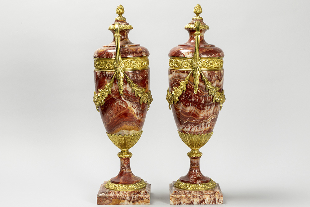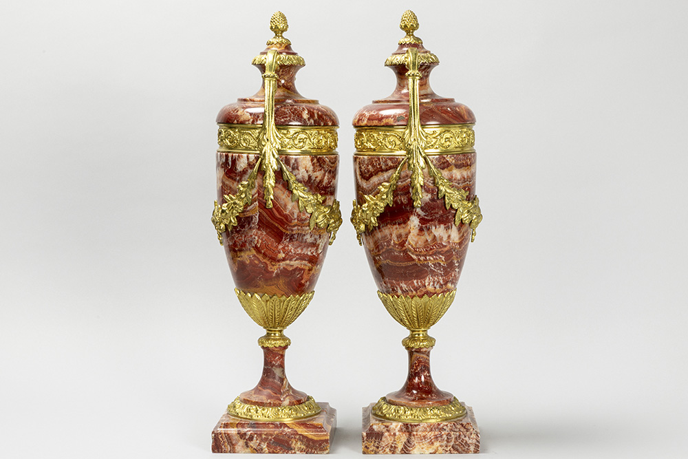 Mooi paar cassoletten in rode marmer met Lodewijk XV-ornamentiek in gedoreerde brons – hoogte : 51,5 cm