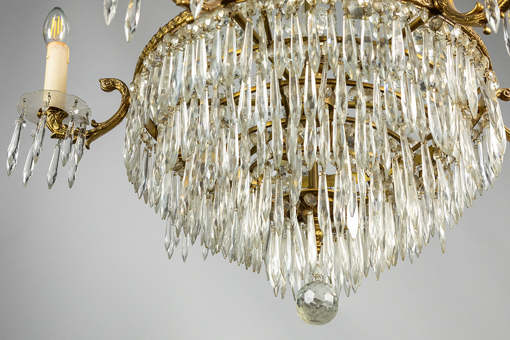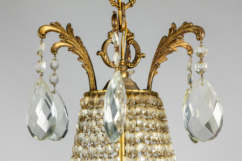 Luster met neoclassicistische sac-à-perlesmodel in gedoreerde brons en kristal – hoogte : 90 cm