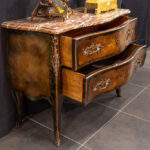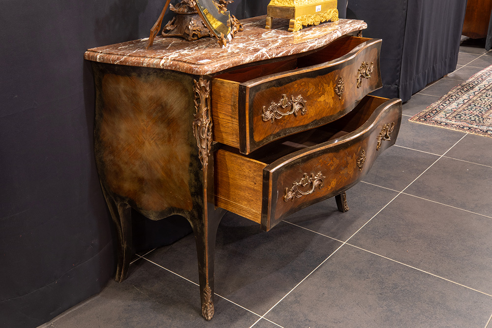’antique’ Louis XV style chest of drawers in marquetry with typical mountings in bronze and with a red marble top