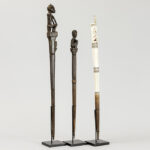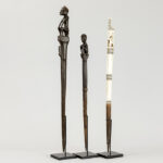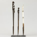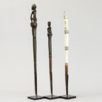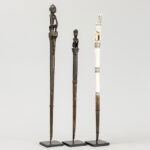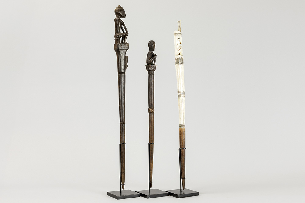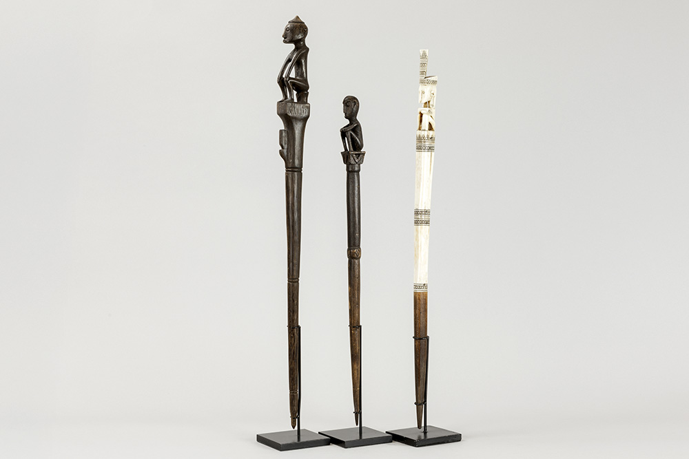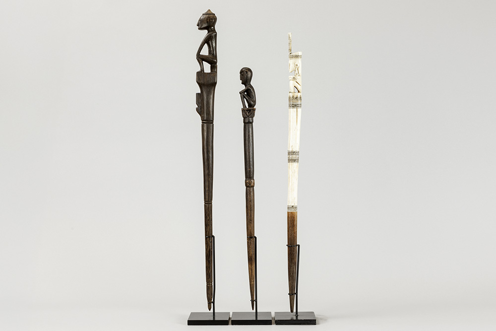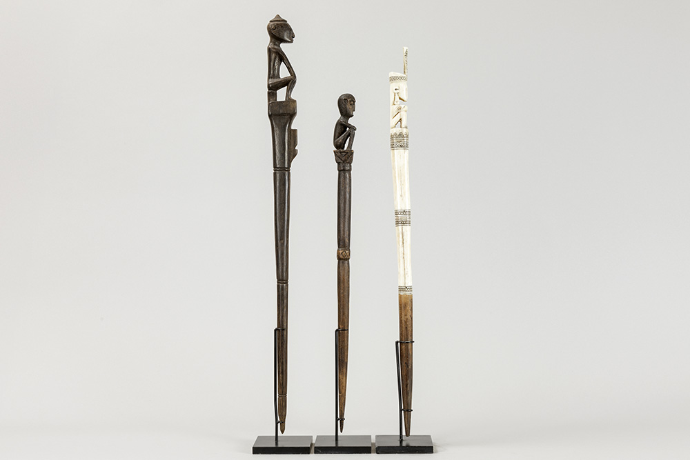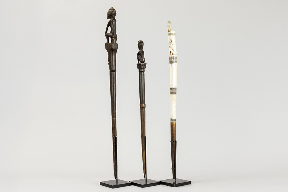three “Tuntun” measure sticks/talismans : two in wood from the Dayak (Borneo) and one in bone and wood from the Nias (Sumatra)