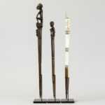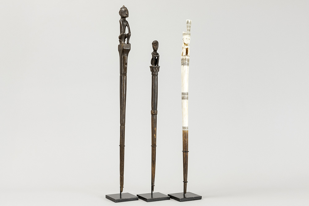 INDONESIË – BORNEO en SUMATRA drie zgn “Tuntun” – maatstokken/amuletten : twee van de Dayak in hardhout en één van de “Nias” (Sumatra) in been en hout – hoogtes van 48,5 tot 60 cm – telkens gemonteerd