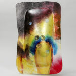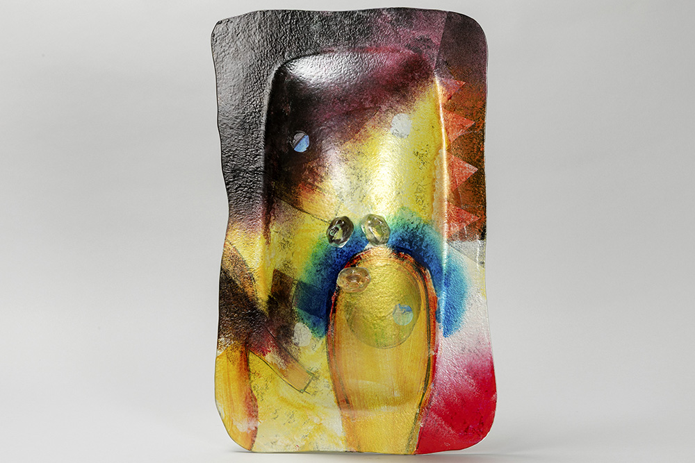 Rechthoekige schaal op pootjes in glas met coupe met polychroom abstract decor – 50 x 31 cm – ca 1990