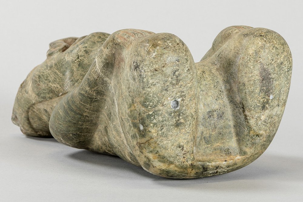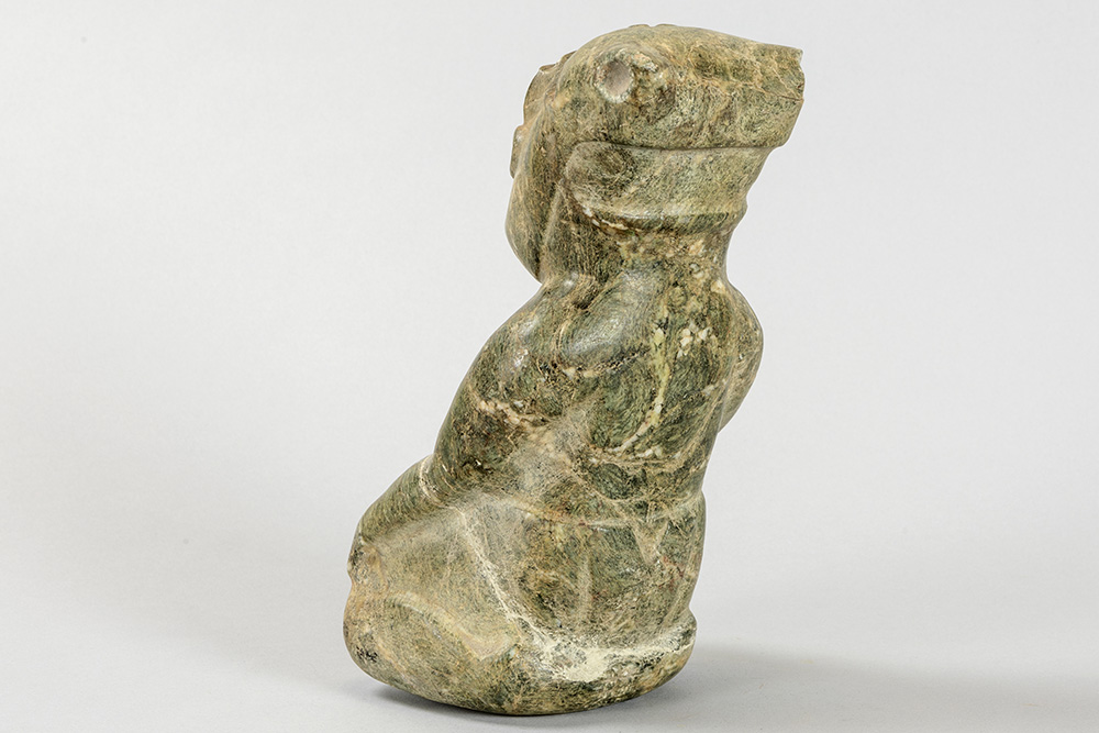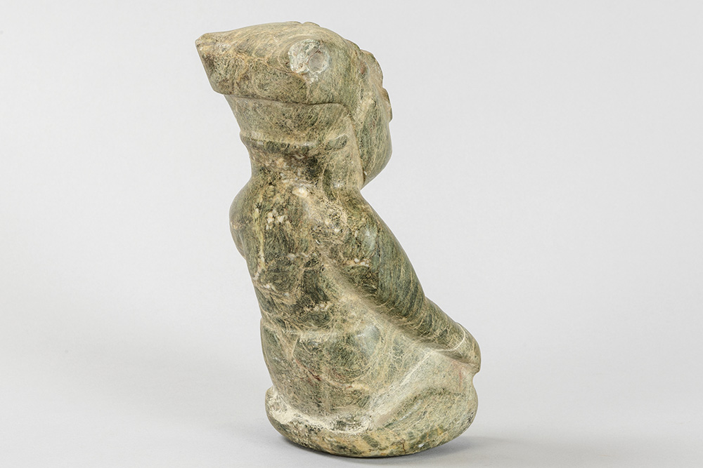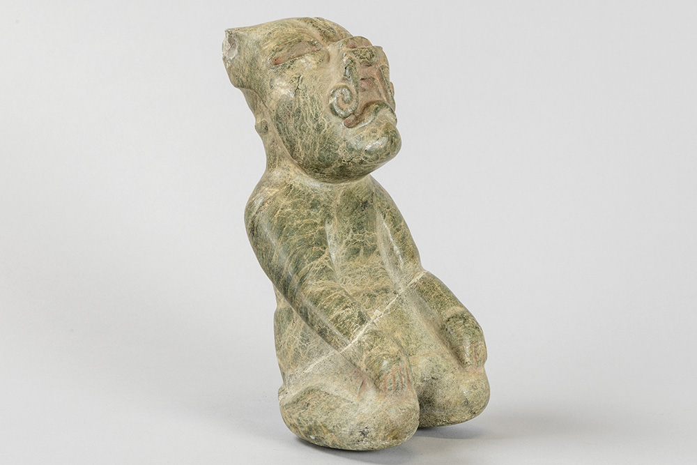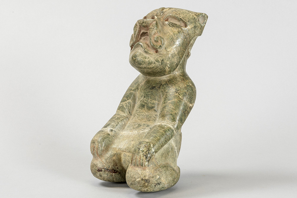 Jade sculptuur in Olmec-stijl met de voorstelling van een zittende man – hoogte : 22 cm prov : Bob Jones van de Jones Gallery in Amsterdam