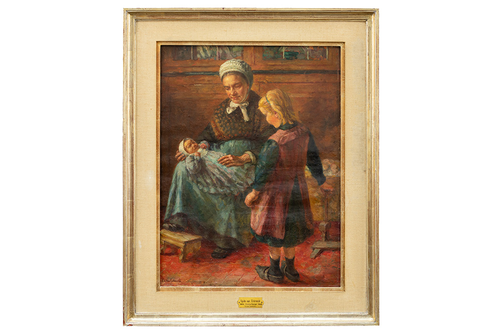 VAN ESBROECK ÉGIDE (19° – 20° EEUW) olieverfschilderij op doek : “Moeder met baby en dochtertje” – 60 x 45 getekend