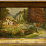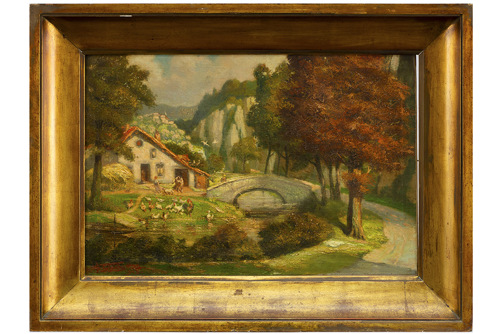 TYTGAT MEDARD (1871 – 1948) olieverfschilderij op doek : “Landschap met hoeve bij bruggetje” – 50 x 75 getekend en gedateerd 1945