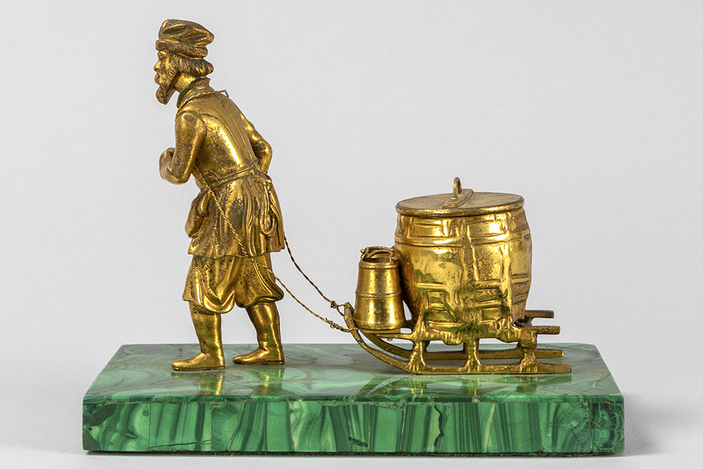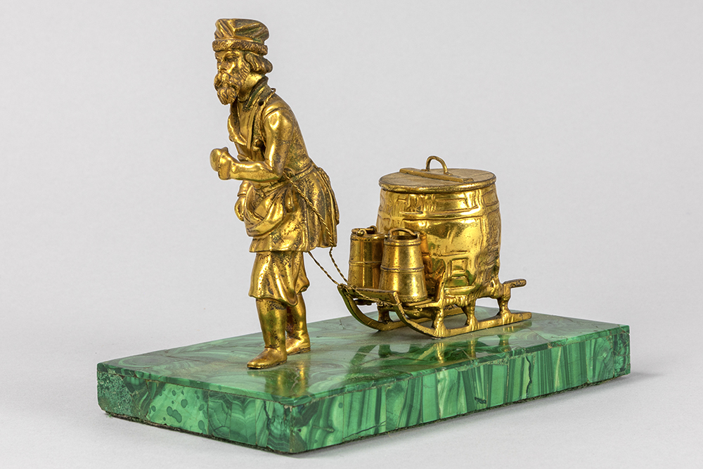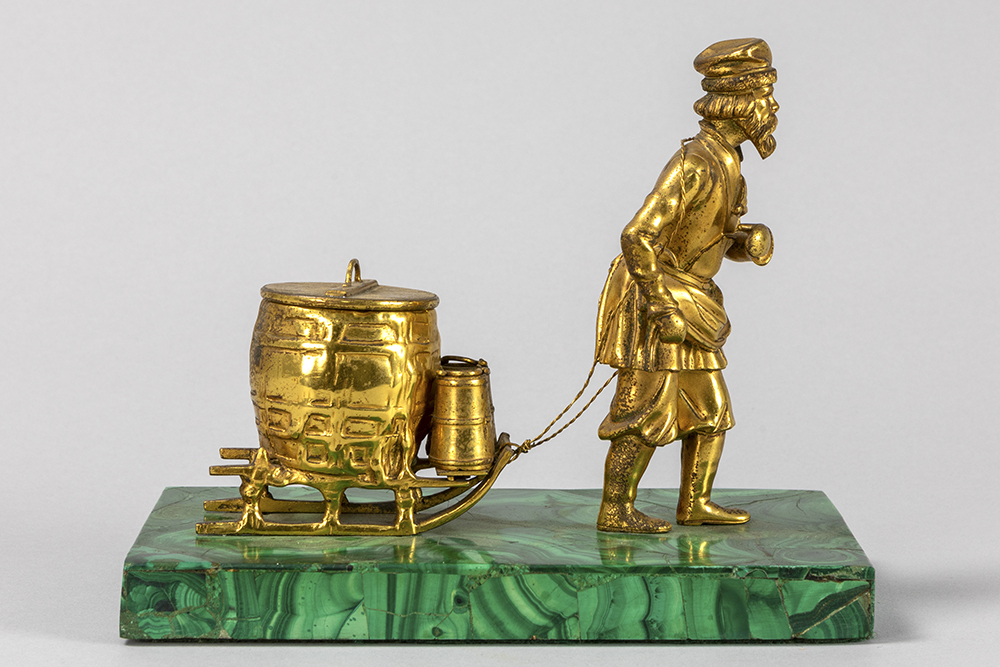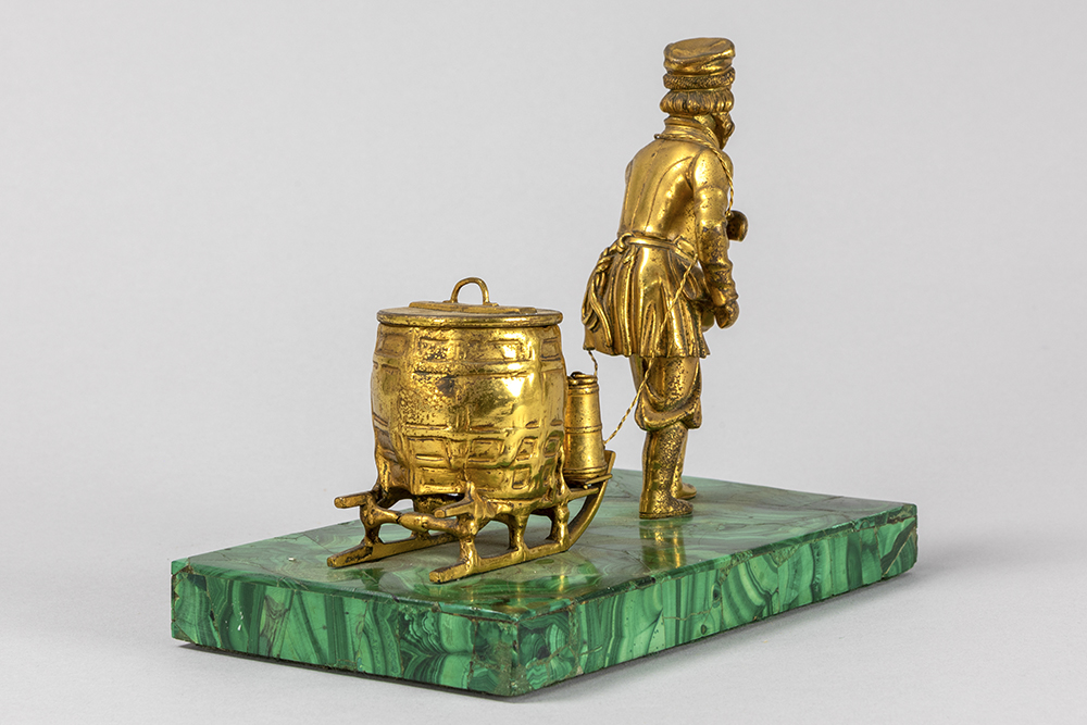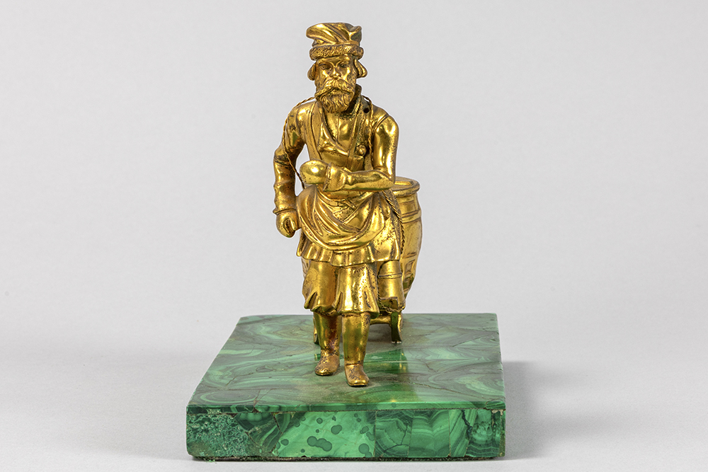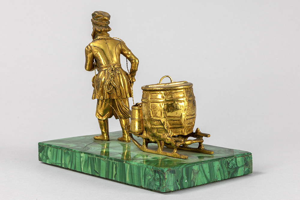 small antique presumably Russian sculpture in gilded bronze on a malachite base : “Man with milk barrel” (= inkwell)
