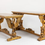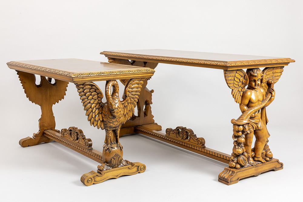 two sofa tables in richly sculpted wood with baroque style ornamentation