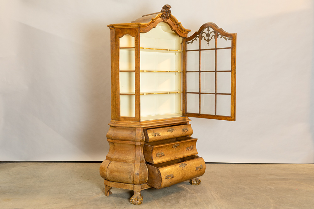 Zgn Hollandse vitrine in notelaar met drie laden en één deur – 220 x 134 x 47 cm