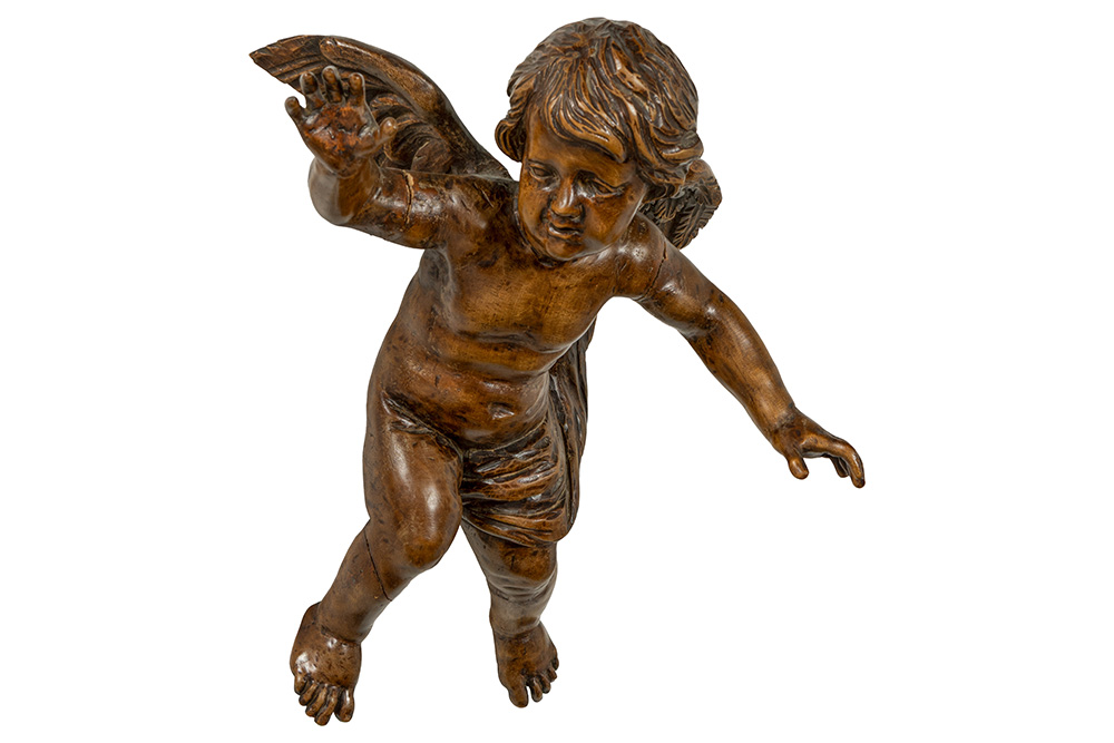 Antieke sculptuur in (linden?)hout : “Gevleugelde engel” – hoogte : ca 50 cm – ca 1700
