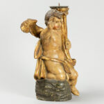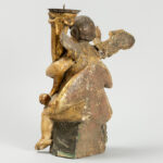 Antieke barokke kandelaar in de vorm van een zittende engel met toorts in gepolychromeerd hout – hoogte : 28 cm