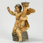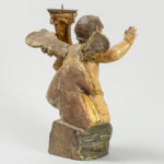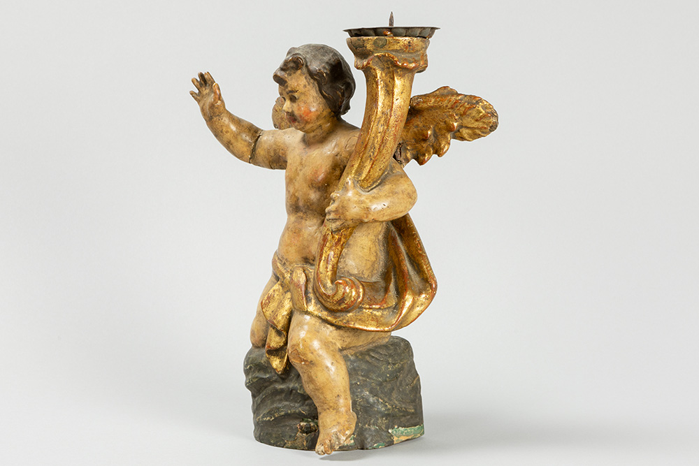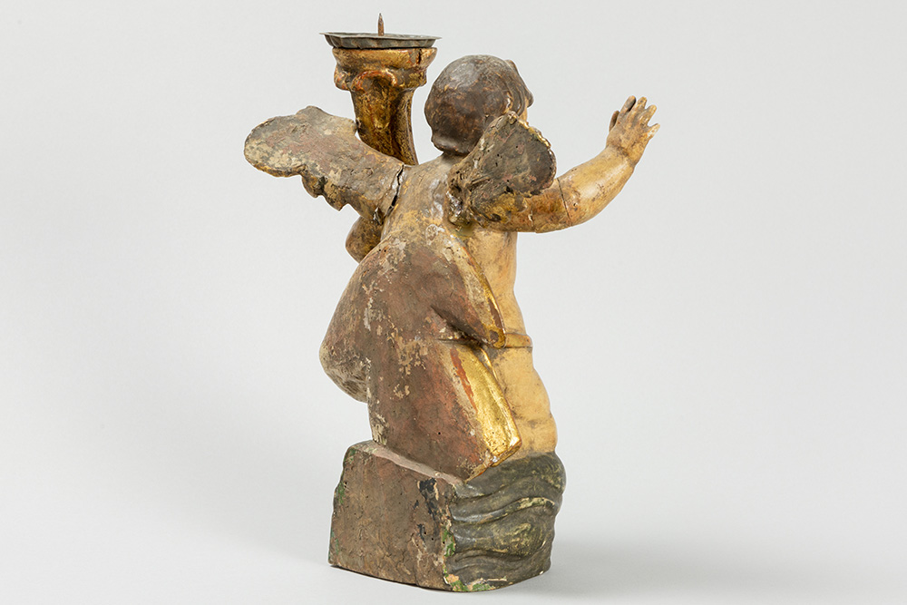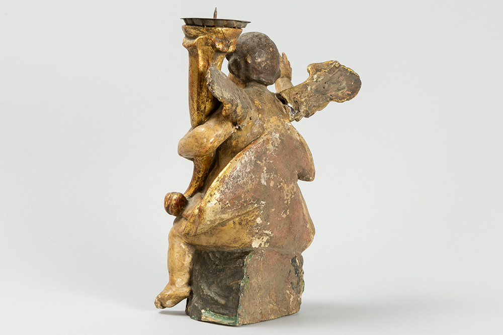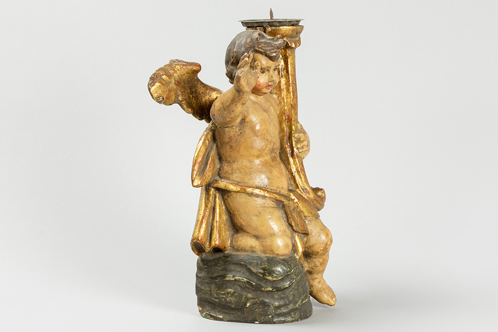 antique baroque style candlestick in polychromed wood and in the shape of a sitting Angel