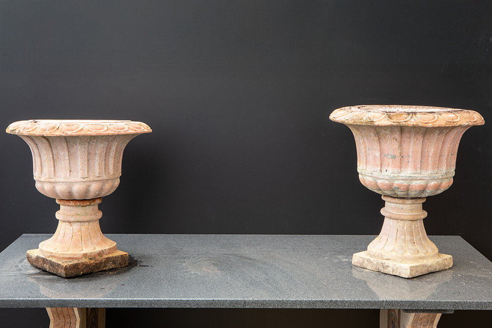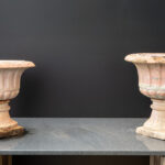 Paar tuinurnes met klassieke vorm in roze marmer – hoogtes : 51 en 55 cm
