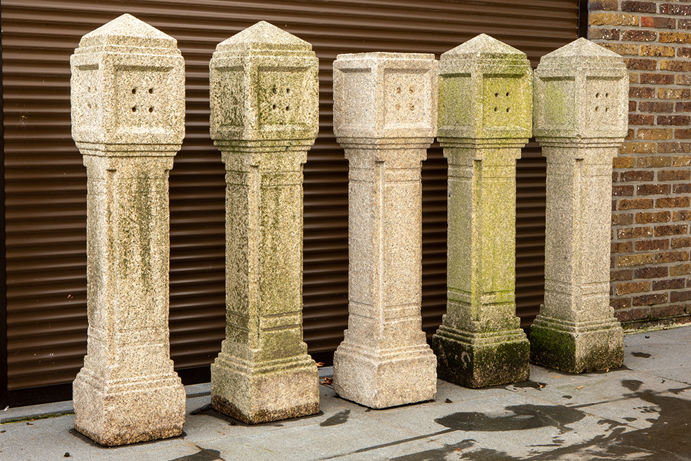 Reeks van vijf antieke pilaren in graniet, in oorsprong deel uitmakend van een communiebank – hoogtes : 113 en 122 cm