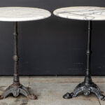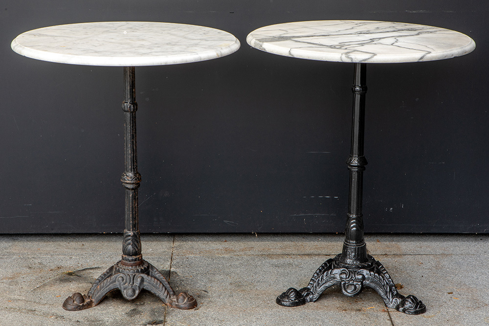Paar leuke bistro-tafeltjes met telkens een voet in smeedijzer en een rond marmeren blad – hoogte en diameter : 73 en 60 cm