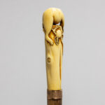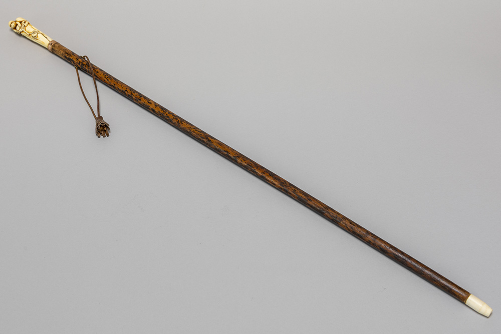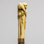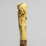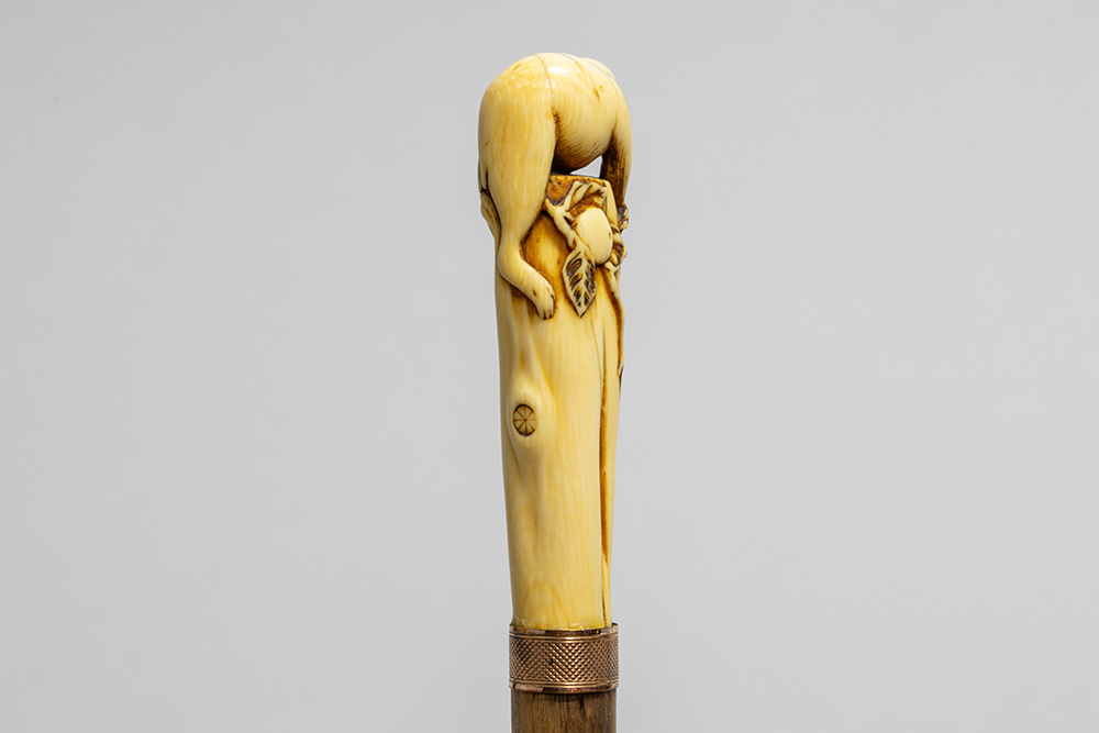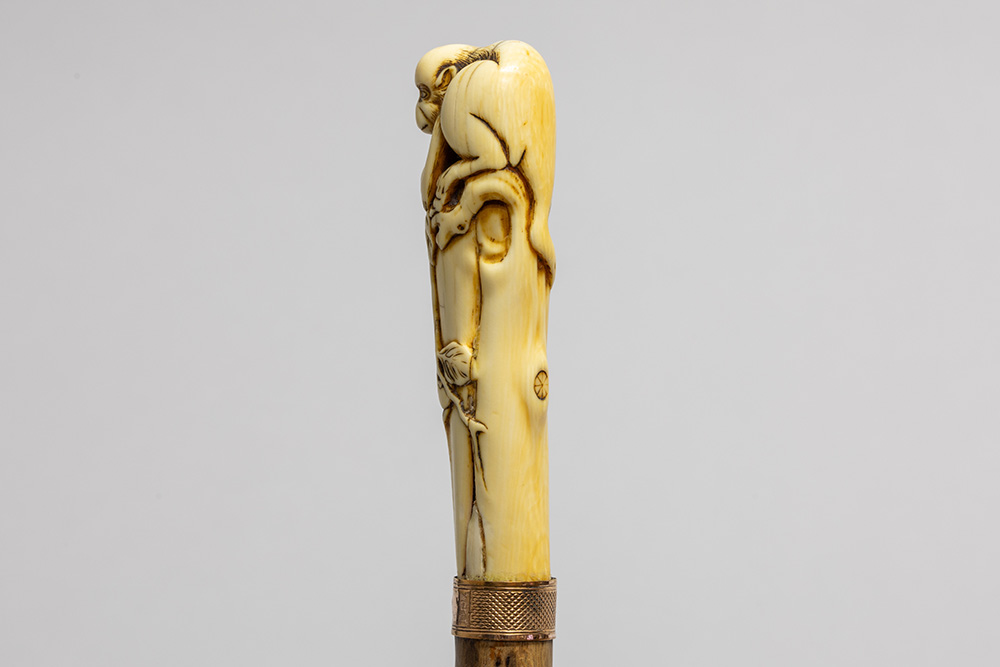 late 19th Cent. European cane with a total height of 93,5 cm and grip in Japanese ivory depicting a monkey on a bush, attached with a ring in copper