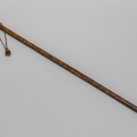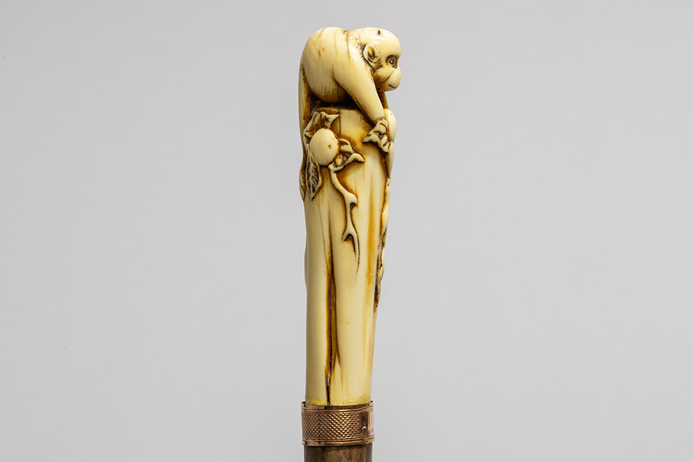 Laat negentiende eeuwse Europese wandelstok met een totale hoogte van 93,5 cm met Japanse greep in ivoor versierd met een aapje zittend op een struik met vruchten – met bevestigingsring in koper