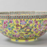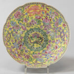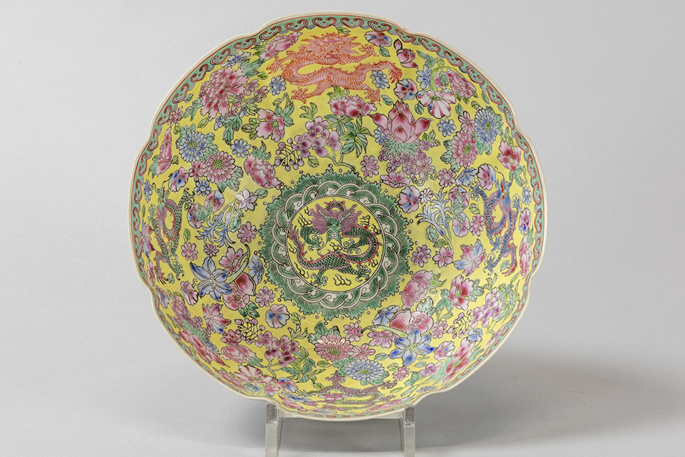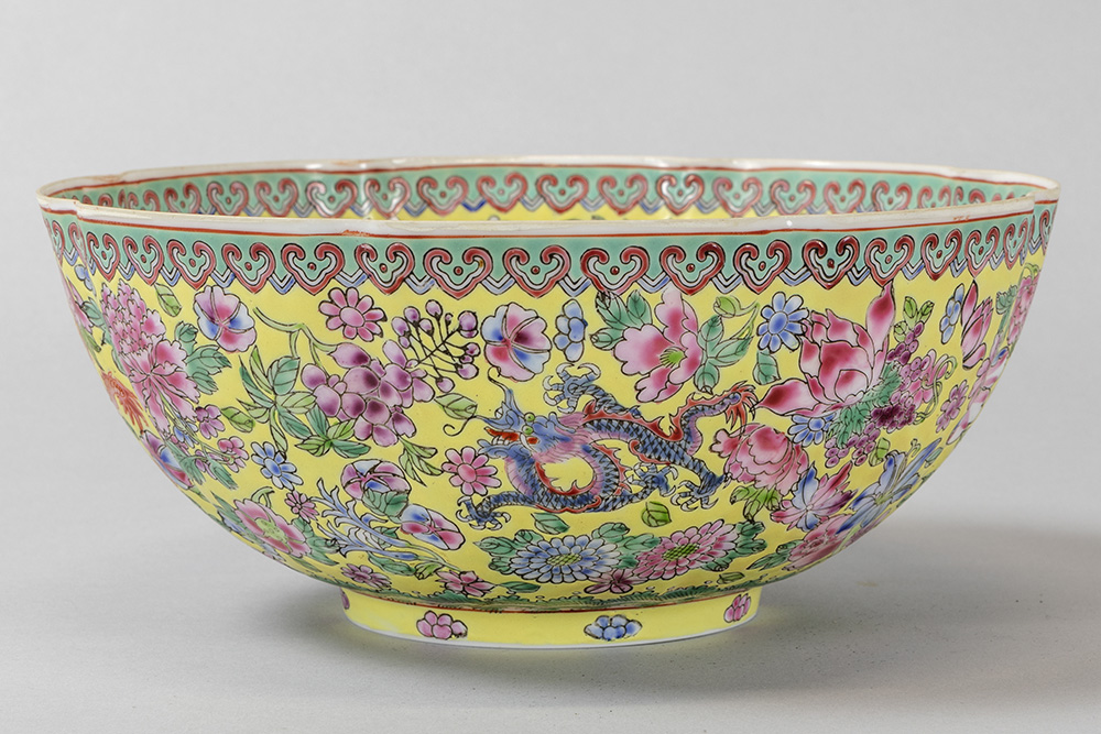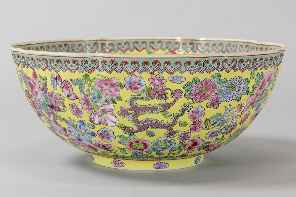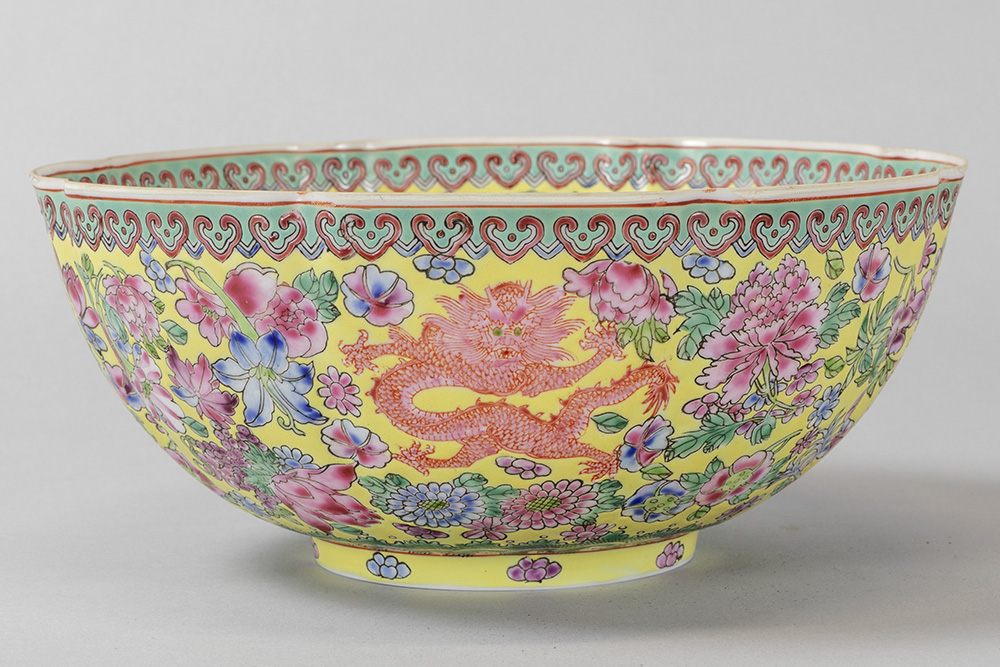 Chinese bowl met gegolfde rand uit de Republiekperiode in gemerkt eierschaalporselein met een Famille Rose-decor met draken tussen bloemen – diameter : 20,6 cm