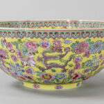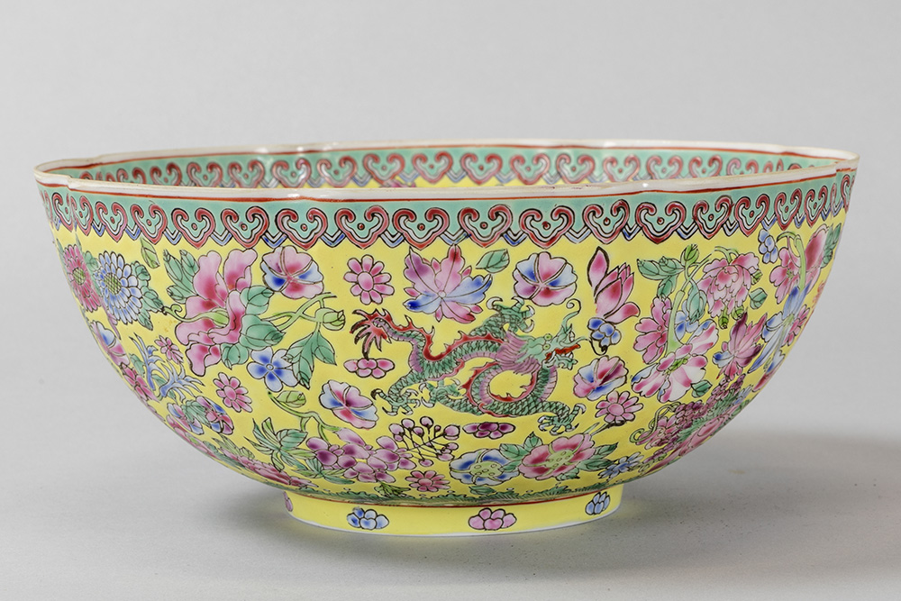 Chinese Republic period bowl in marked eggshell porcelain with a ‘Famille Rose’ decor with dragons amongst flowers