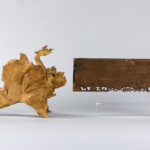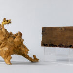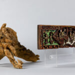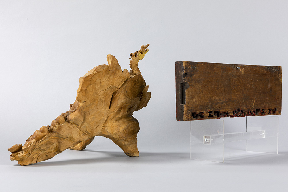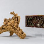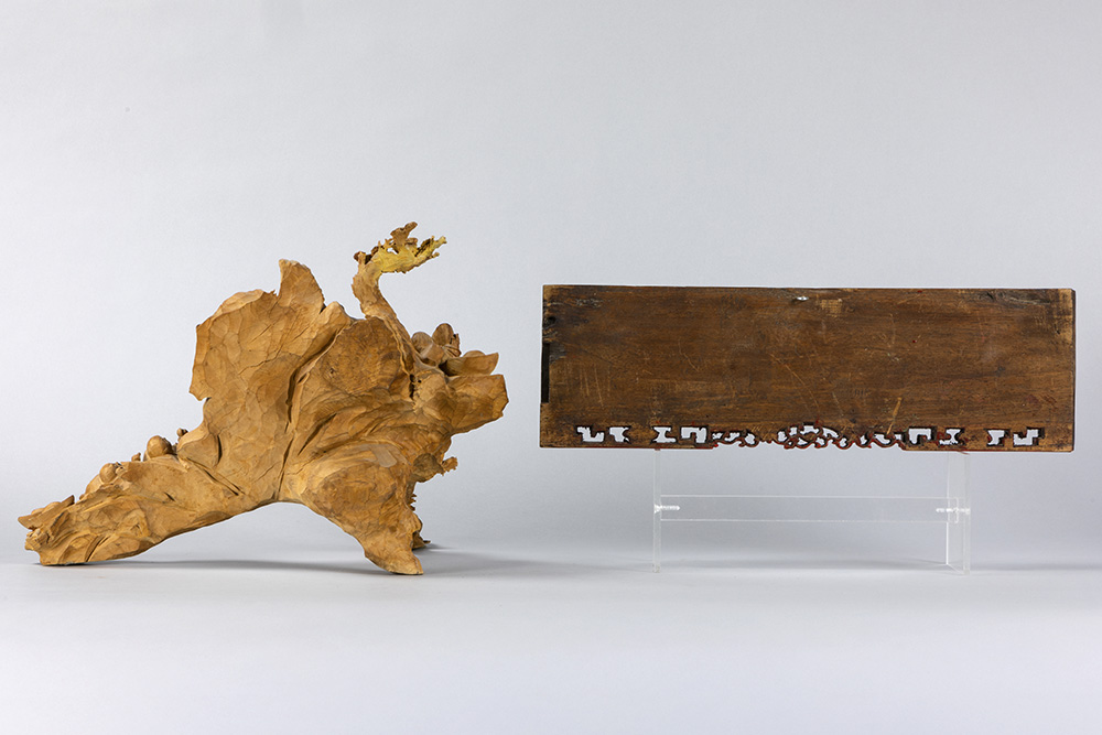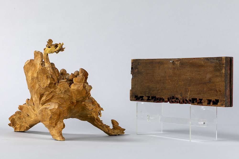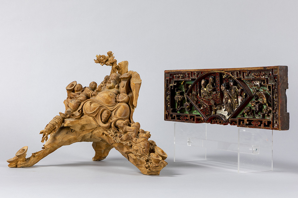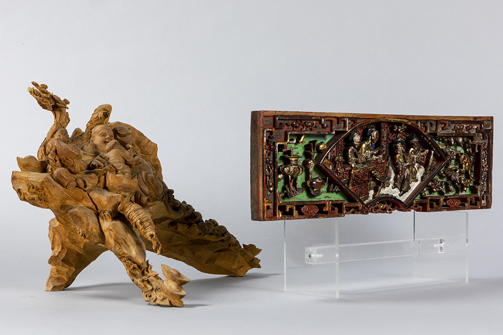 two Chinese items : a ‘Buddha’ sculpture in wood and a lacquered panel