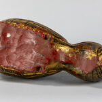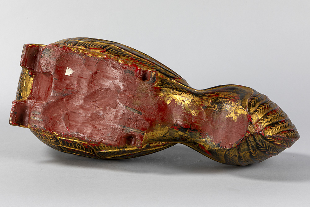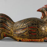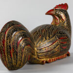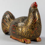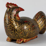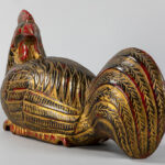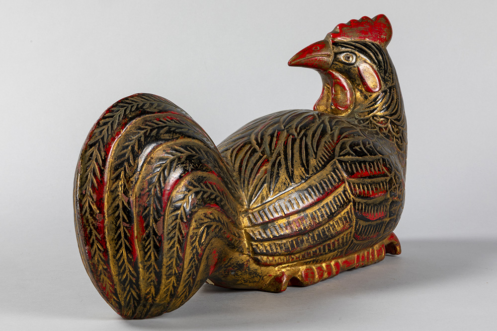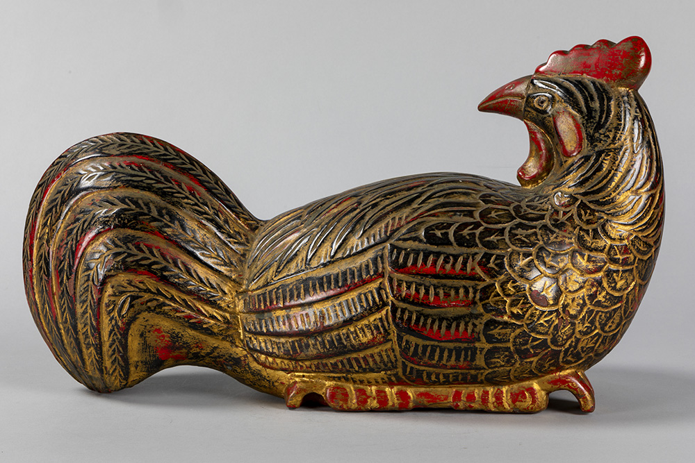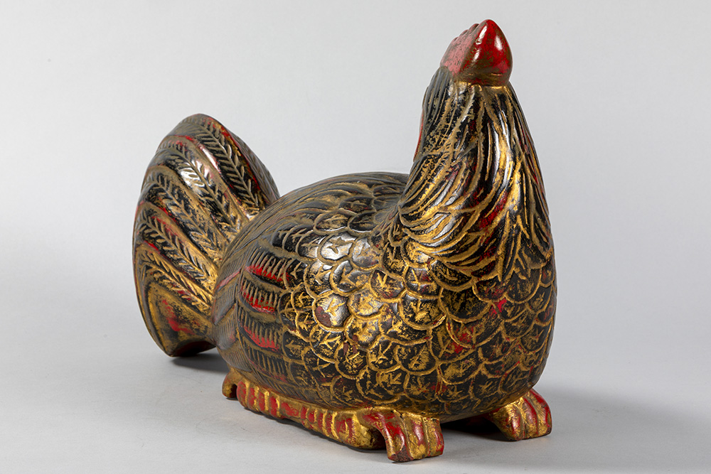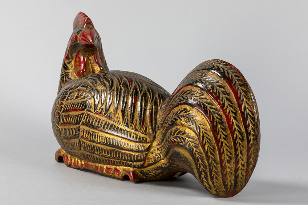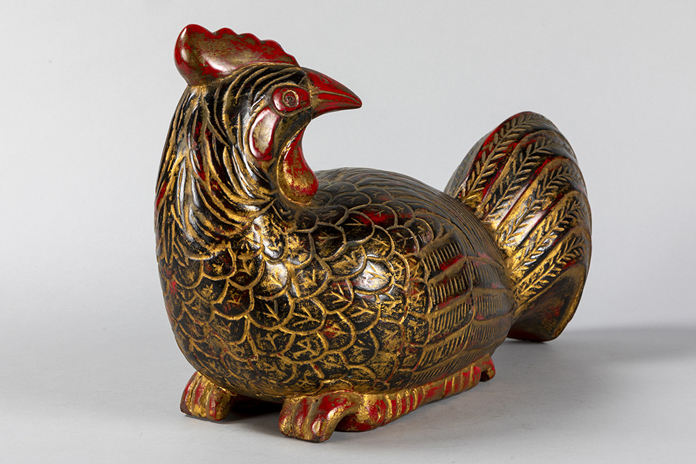 Allicht Birmaanse houtsculptuur met lakwerk : “Zittende haan” – hoogte en breedte : 28 en 49 cm