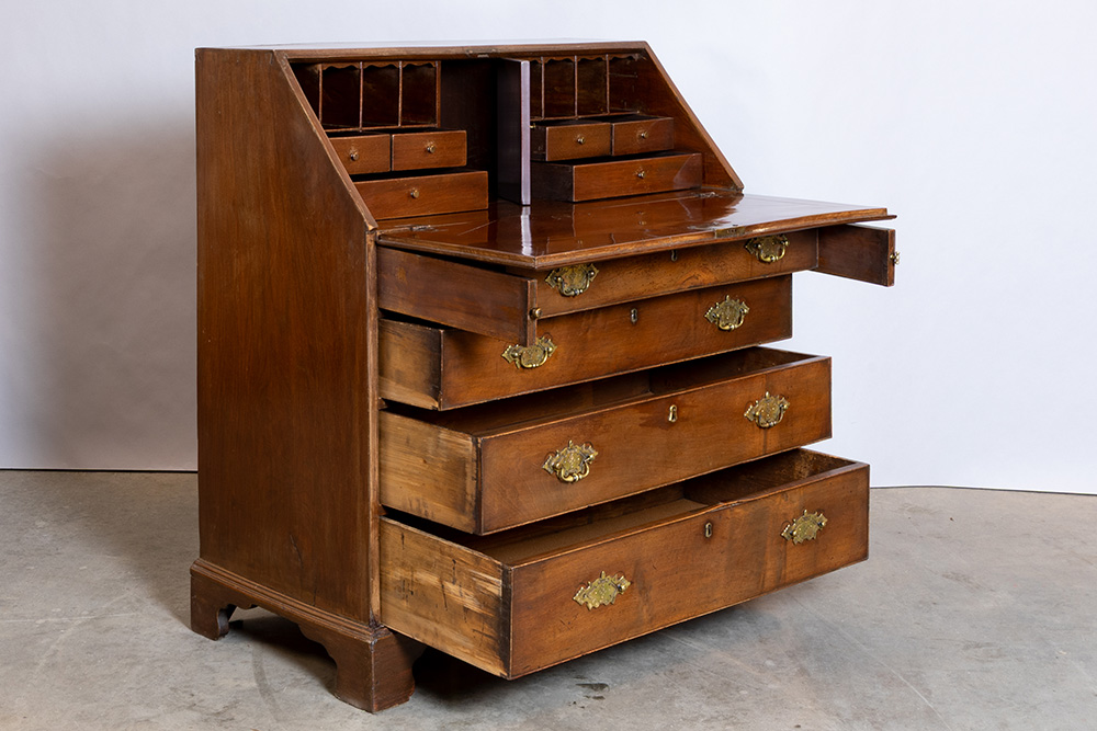Engelse secretaire met typisch Georgian model in acajou – met vier laden en met neervallend blad dat een typisch interieur verbergt  –  104 x 90 x 50 cm