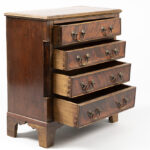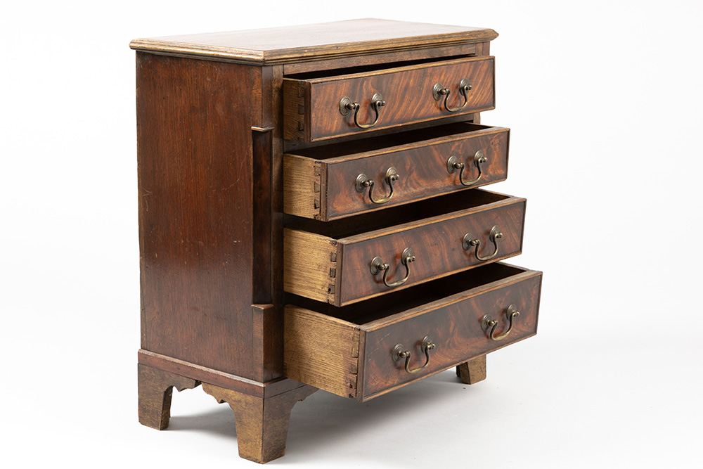 Kleine antieke poppencommode in acajou met vier laden en twee halfzuiltjes – 56 x 53 x 26 cm