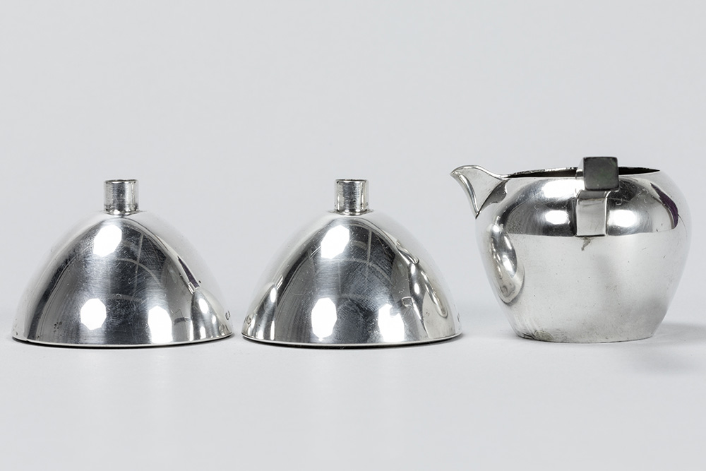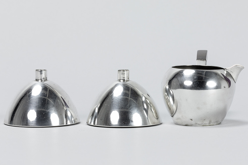 three pieces of marked silver : a pair of Belgian Art Deco candlesticks and a small Puiforcat signed jug