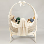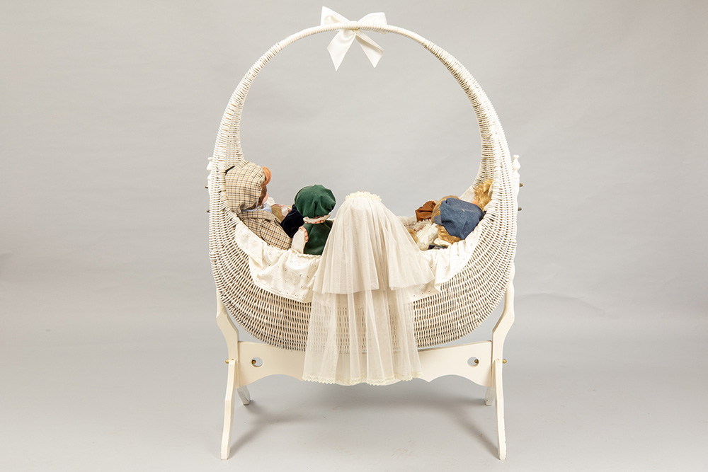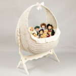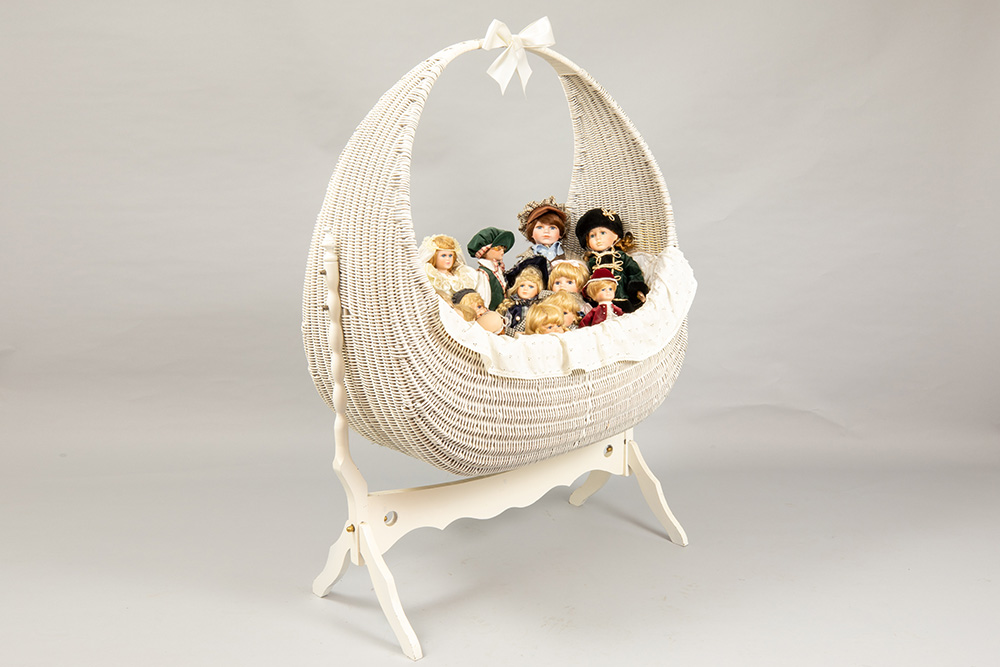 collection of porcelain head dolls in a cradle