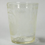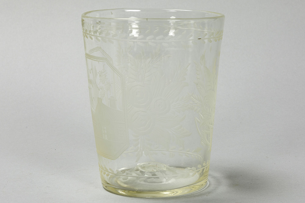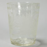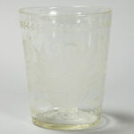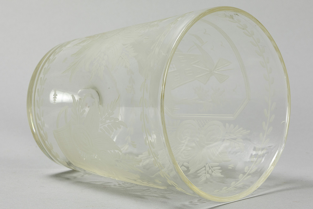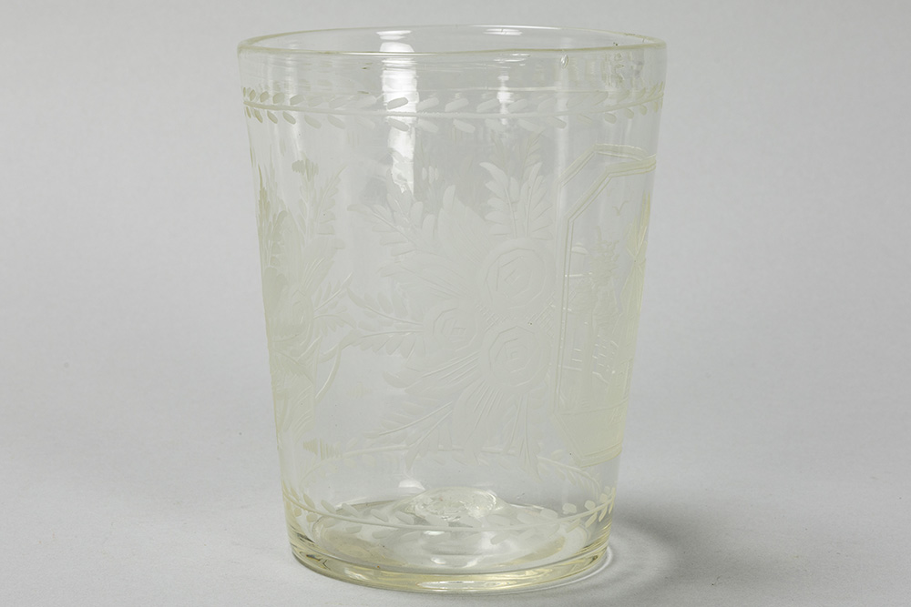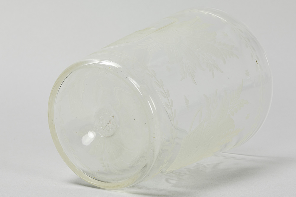 Antieke beker in kleurloos glas met geëtste decors – hoogte : 14,5 cm